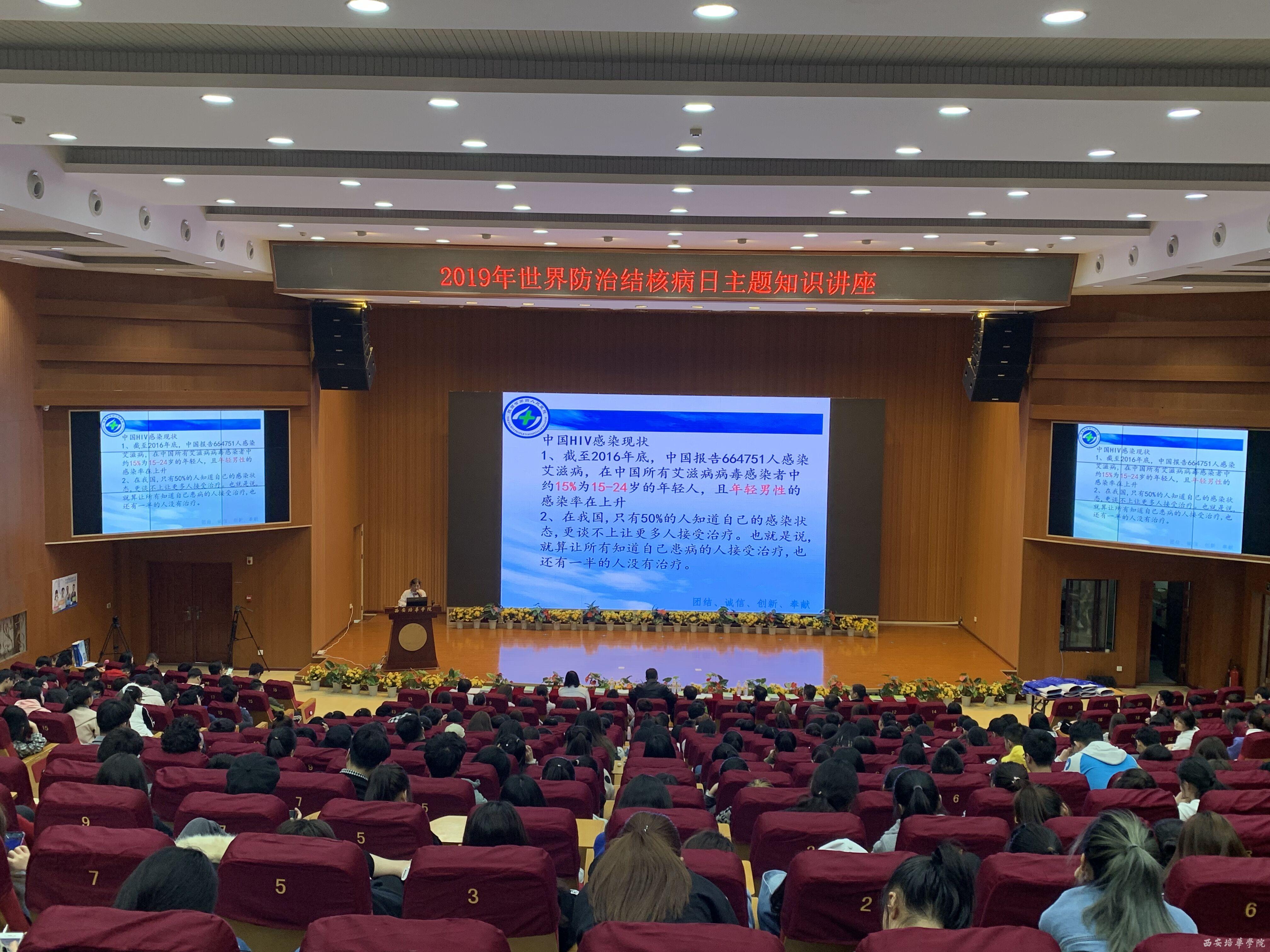 为了进一步加强学校结核病防控工作,增强师生对结核病的防治意识,3月22日下午,学生服务中心联合校医院在图书馆报告厅特举办2019年世界防治结核病日主题知识讲座。西安培华学院医学院常务副院长刘利兵,校医院院长李旭军,团委书记、学生服务中心副主任蔡亮,后勤服务中心主任赵维仪,各二级院的领导、辅导员和学生代表共500余人参加了此次讲座。