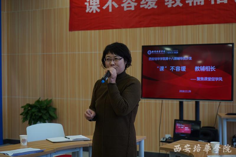 本次沙龙的主题是“课不容缓、教辅相长--聚焦课堂、促学风”。会计与金融学院常务副院长王西娅在致辞中表示,作为管理者跟老师的双重身份,在促进学风建设方面应明确目标计划,主动提升意识,做好环境营造。她强调,应重点关注学生的纪律自治意识,采取严查无课本课堂,一对一互帮互助等方法让每个学生主动参与、主动维护,对推进学风建设有所裨益。