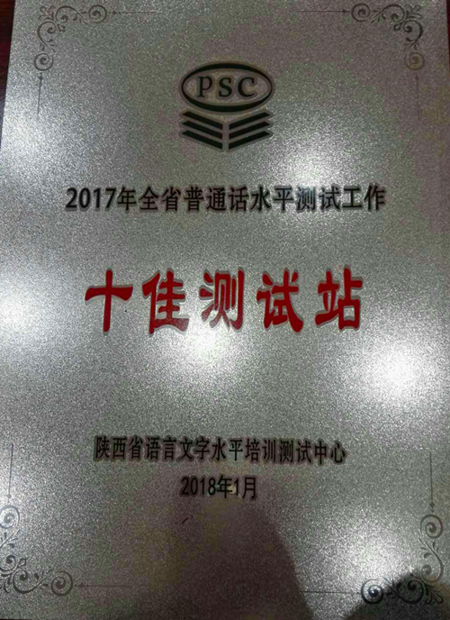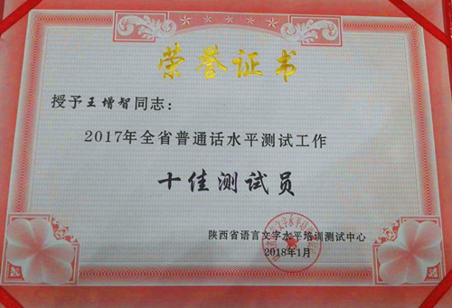 2018年1月,陕西省语言文字水平培训测试中心公布了2017年度普通话水平培训测试十佳测试站、十佳测试员评选结果,我校语言文字水平培训测试中心被评为十佳测试站,王增智老师被评为十佳测试员。