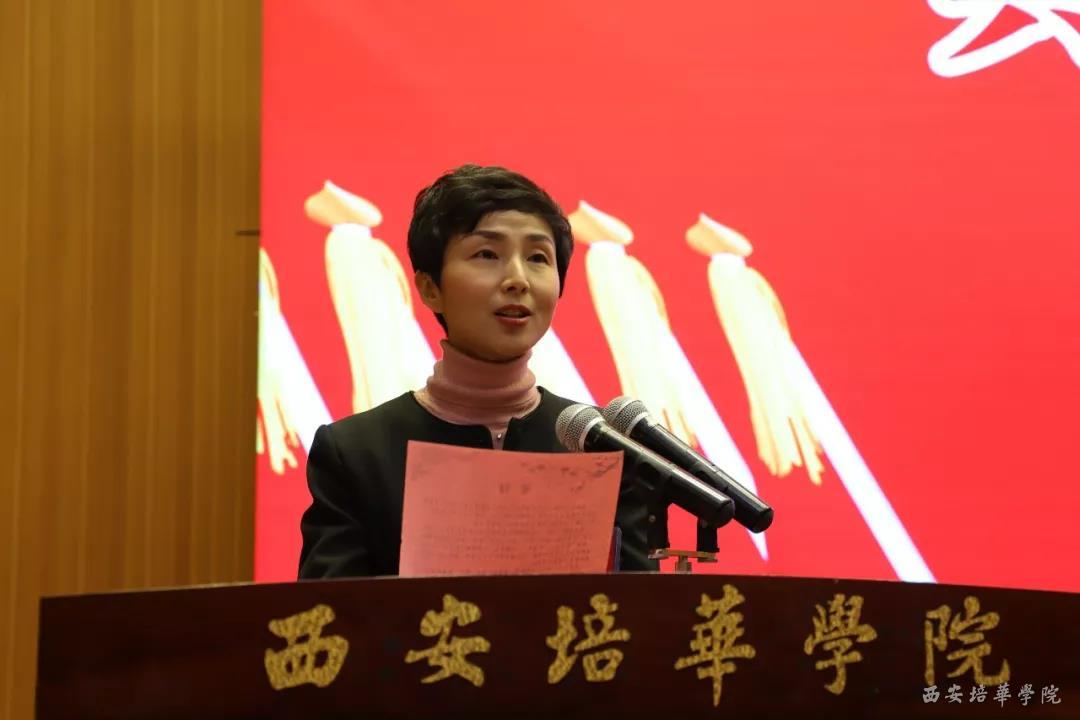 西安培华学院党委副书记、副校长姚文静同志宣读西安培华学院理事长姜波贺词、全国民办高校(独立学院)共青团工作联盟秘书处贺信