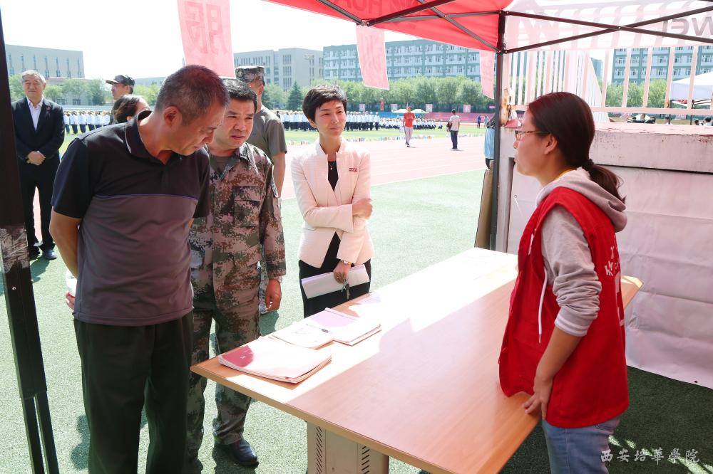 陕西省预备役高炮师四团参谋长曹海滨中校,西安培华学院军训团副团长王刚,西安培华学院学生服务中心副主任徐莹等陪同视察。