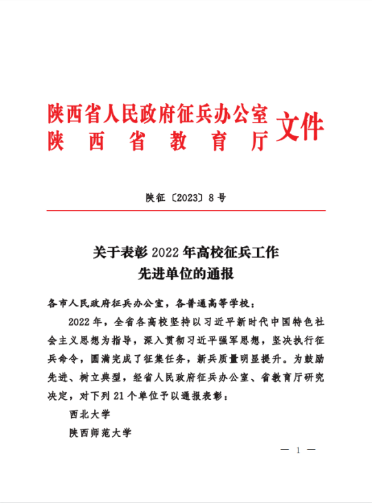 近日,陕西省人民政府征兵办公室省教育厅通报表彰2022年度高校征兵工作先进单位,我校荣获2022年度高校“征兵工作先进单位”荣誉称号。