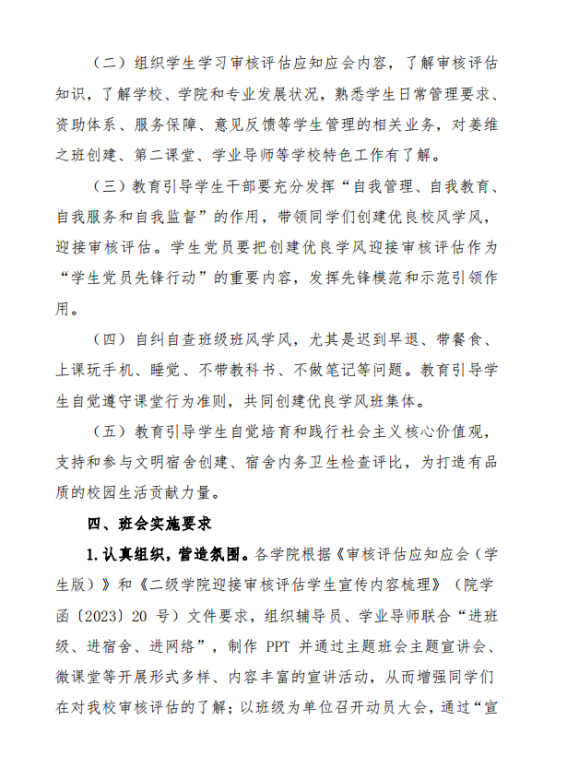 根据要求,本次主题班会主要围绕五个方面开展:一是教育引导学生全面了解和掌握开展本科审核评估的意义与目的,以及审核评估对于学校和学生发展的重要性,努力营造浓厚的校园迎评氛围。二是组织学生学习审核评估应知应会内容,了解审核评估知识,了解学校、学院和专业发展状况,熟悉学生日常管理要求、资助体系、服务保障、意见反馈等学生管理的相关业务,对姜维之班创建、第二课堂、学业导师等学校特色工作有了解。三是教育引导学生干部要充分发挥“自我管理、自我教育、自我服务和自我监督”的作用,带领同学们创建优良校风学风,迎接审核评估。学生党员要把创建优良学风迎接审核评估作为“学生党员先锋行动”的重要内容,发挥先锋模范和示范引领作用。四是自纠自查班级班风学风,尤其是迟到早退、带餐食、上课玩手机、睡觉、不带教科书、不做笔记等问题。教育引导学生自觉遵守课堂行为准则,共同创建优良学风班集体。五是教育引导学生自觉培育和践行社会主义核心价值观,支持和参与文明宿舍创建、宿舍内务卫生检查评比,为打造有品质的校园生活贡献力量。