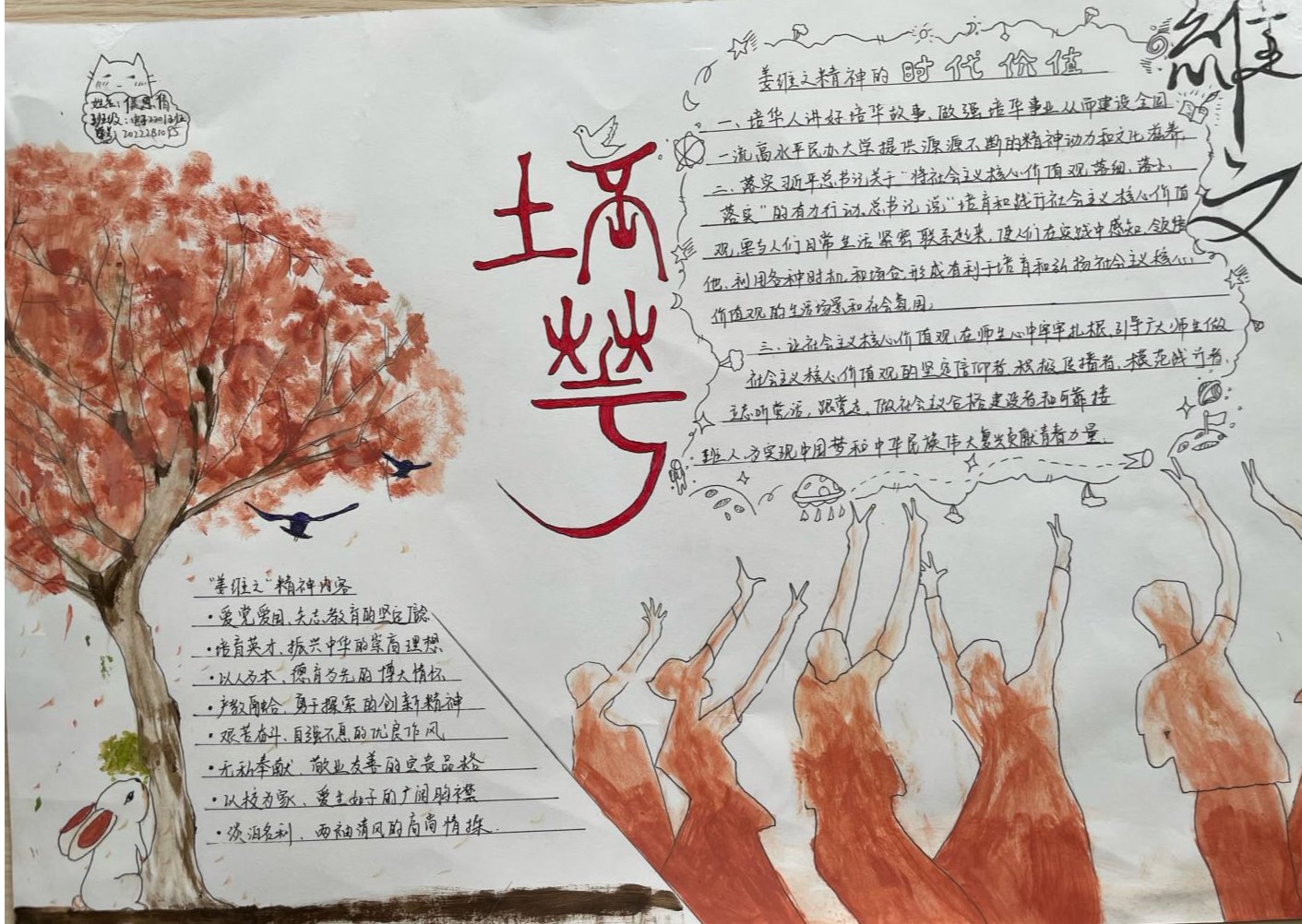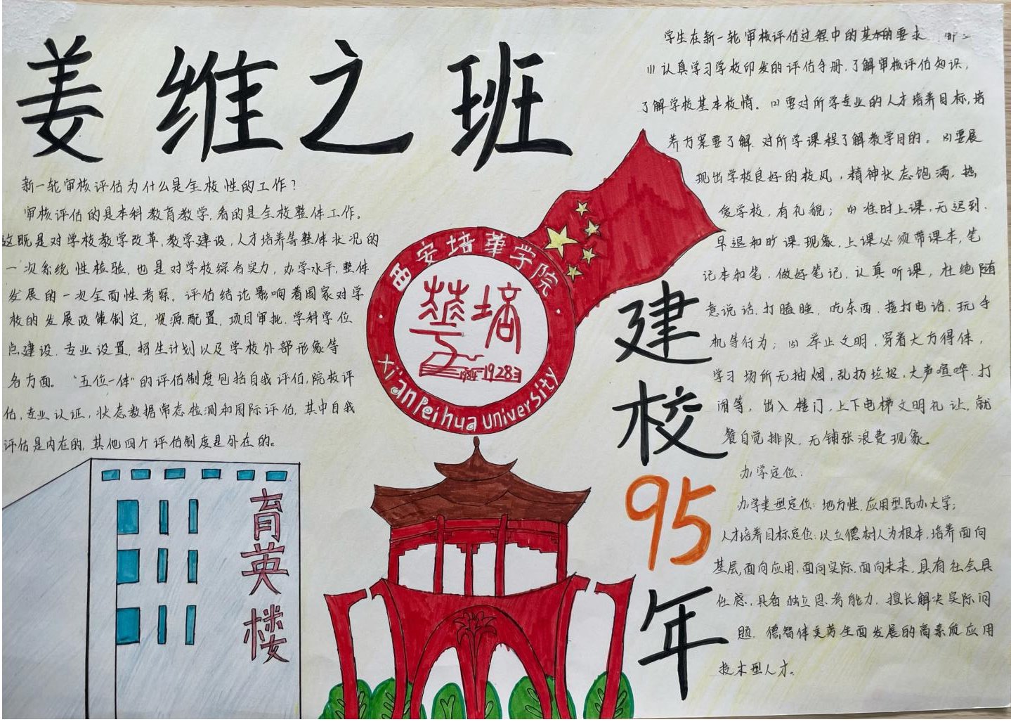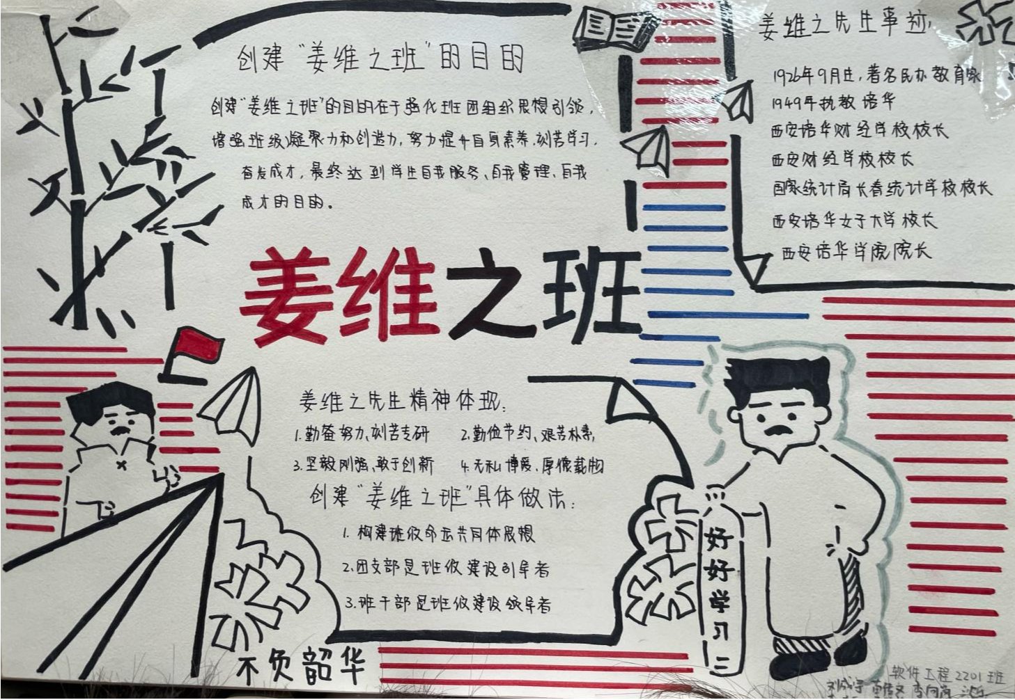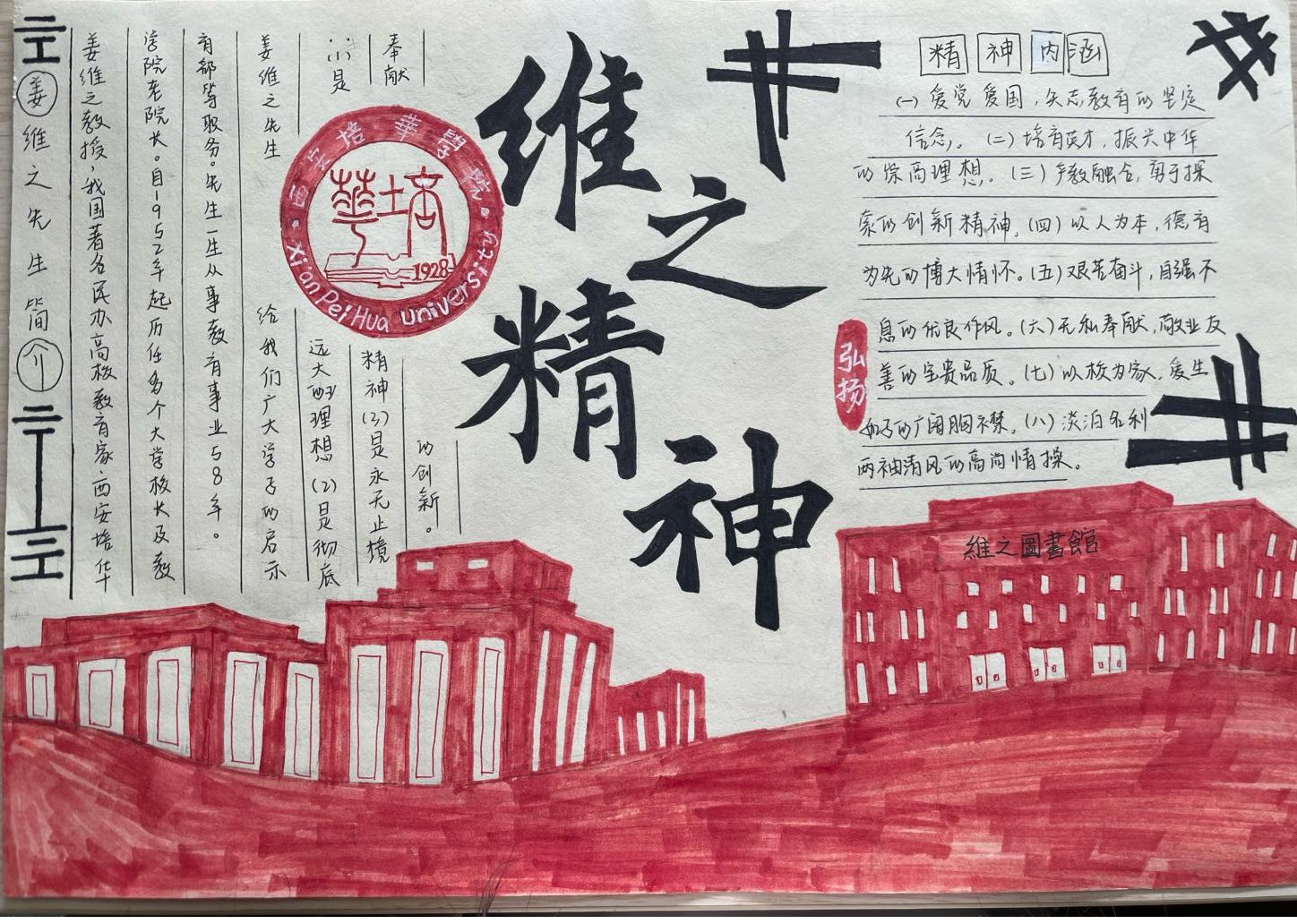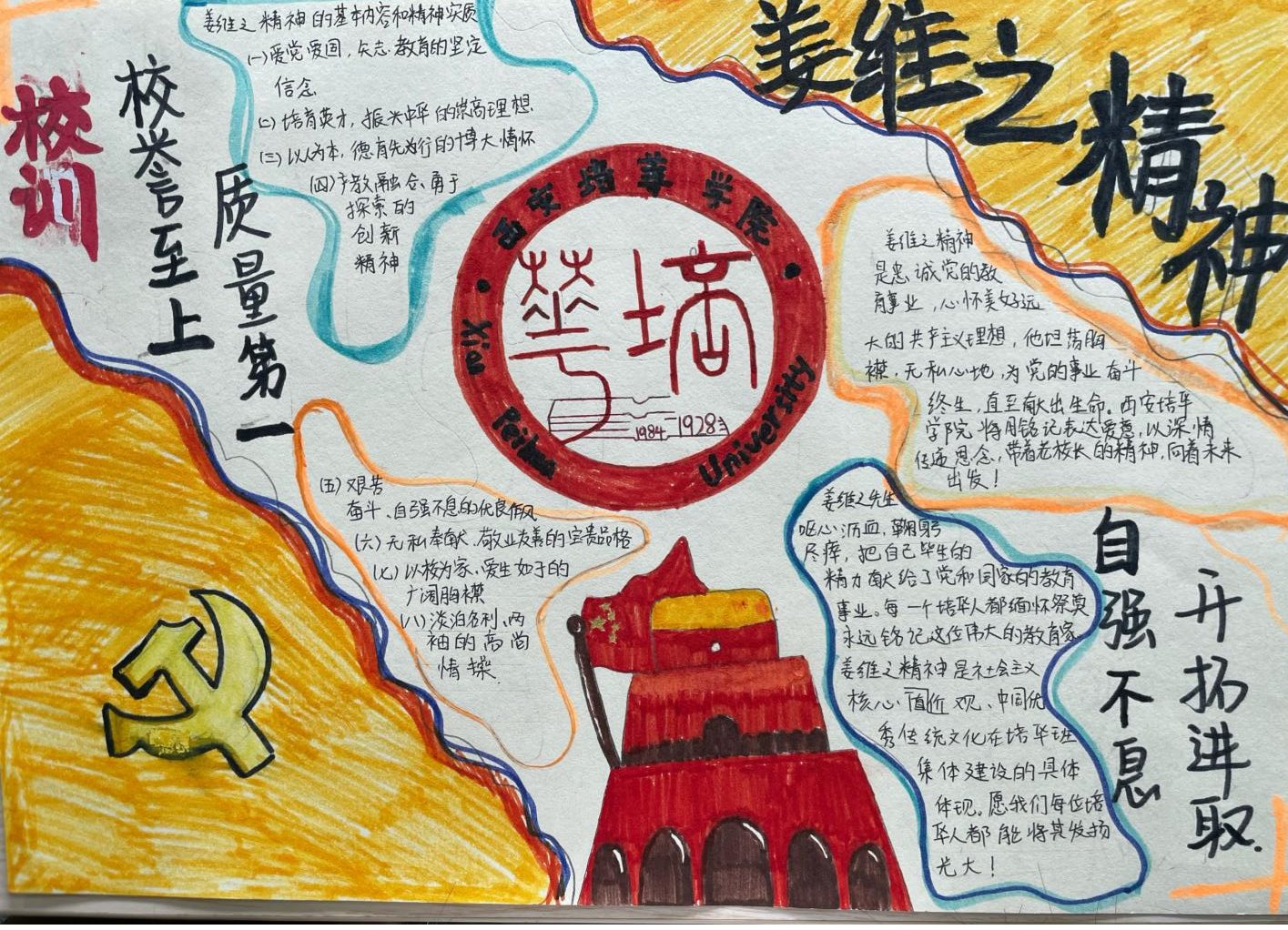 姜维之老校长一生忠于教育事业,严格践行“以人为本、以德为先”的办学理念,注重教育教学质量和学生综合素质,办人民满意的大学,赢得了政府和社会各界的一致好评。是当代中国民办高等教育的开拓者,为陕西乃至全国民办高教事业的发展做出了杰出贡献。“姜维之班”的创建,是一种精神的传承,是我们每一位培华师生的力量源泉。不同的手抄报从各个维度、各个层面很好的诠释了姜维之精神的内涵,充分展示了智信青年对创建“姜维之班”的热情和积极性,具有很强的学习意义和宣传价值。也为我们深入了解维之精神、践行维之精神提供了更好的渠道。