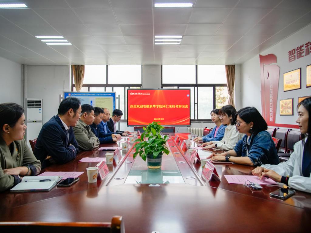 为交流经验、提升学生工作管理能力,优化学生工作管理措施,完善学生工作管理制度。5月8日上午,安徽新华学院学生处处长芮萍一行4人来我校进行调研交流。我校党委学工部部长蔡亮,党委学工部副部长权勇太,校团委书记杨媛,智能科学与信息工程学院党总支书记王林等在智能科学与信息工程学院党员活动室接待了来访嘉宾一行。
