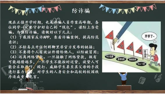 为切实增强师生安全意识,树立“生命至上,安全第一”的思想,扎实有效地为推进学校的各项工作打下坚实的基础,针对全校学生开展了安全教育。一是重点围绕消防安全、用电安全、心理情感等内容,开展扎实有效的安全主题教育。尤其是学生寝室禁止使用违章电器的防火防电安全教育。使学生树立自护、自救观念,形成自护、自救的意识,使学生安全、健康成长。二是围绕大学生意识形态安全开展教育,树立反间谍意识,学习网络言论的相关法律知识以及高校实际案例讲解,坚决不发表有损个人、班级、学院、学校、党和国家形象的言论,在网络中积极传递“正能量”,做净化网络环境的践行者。三是针对防电信诈骗、防校园贷等,结合高校实例,开展讲解。向同学们介绍反诈APP,并有效引导同学们安装使用该软件。通过一系列措施,强化警示教育,构筑红线意识,提高安全风险规避能力,营造校园安全氛围。四是通过了解学生暑期学习生活情况,掌握学生心理动态,重点聚焦集体生活适应、人际关系调节、恋爱心理、时间管理等问题,通过有效途径,引导学生在服务奉献社会的过程中实现自我价值,增强抵御挫折的能力和心理弹性。