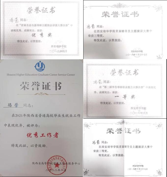 冯莹,女,中共党员,讲师,2009年9月担任辅导员,现任医学院学生干事兼学生第一支部书记。考取国家心理咨询师三级、国家职业指导师二级、健康管理师三级、北森生涯规划师(BCF)等资格证书。本人自入职以来获得省级奖项1项,校级奖项14余项;在2022年陕西省普通高校毕业生就业工作中表现优异,被评为:优秀工作者;在2022年度西安培华学院“一站式”学生社区建设各项工作中,表现优秀,成绩卓越,被评为优秀德育导师;2023年获得西安培华学院“优秀德育指导老师”荣誉称号;也曾获西安培华学院第二届辅导员素质能力大赛一等奖;首届辅导员主题演讲大赛三等奖;首届辅导员主题班会讲课大赛”优秀奖;第五届辅导员素质能力大赛优秀奖、多次获得西安培华学院大学生就业创业节“名花有主”大赛优秀指导教师;西安培华学院“就业工作先进个人”、学生潜能发展优秀指导师等荣誉称号。