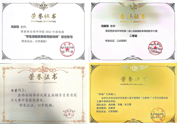 冯窦菲,女,中共党员,讲师,现任人文与国际教育学院学生干事。国家心理咨询师三级、健康管理师三级,一直从事学生思想政治教育和大学生心理健康教育工作。担任《大学生心理健康教育》《生涯规划与体验教育》课程教师。荣获第六届陕西省高校优秀辅导员、全国大学生创新促进就业(简历设计)大赛全国优秀指导教师、第四届陕西高校心理健康教育优秀教案一等奖、陕西省“心相遇 爱同行——心理健康教育伴我成长”主题征文优秀指导教师、校级大学生心理健康教育课程大赛二等奖、西安培华学院第六届中国国际“互联网+”大学生创新创业优秀指导老师、西安培华学院第十二届“名花有主”求职大赛优秀指导老师、西安培华学院巾帼建功标兵等多项荣誉称号。