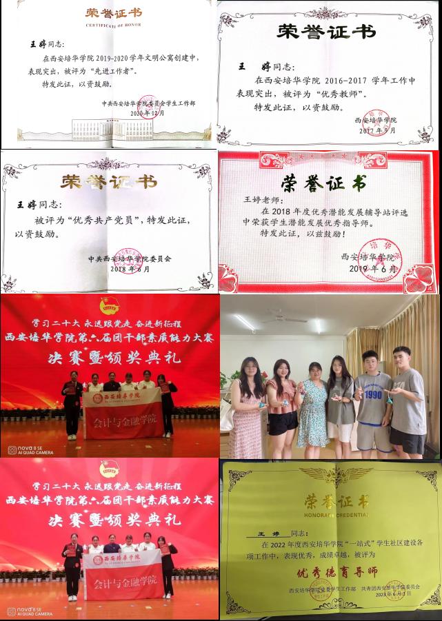 王婷,中共党员,2015年9月担任辅导员,现任会计与金融学院辅导员兼学院第六党支部书记。所带班级曾获得先进班集体、优秀团支部以及西安培华学院心理情景剧三等奖。2023年7月指导学生参加西安培华学院“互联网+”,大学生创新创业优秀指导老师。2017年10月获得西安培华学院优秀教师荣誉称号;2018年5月荣获西安培华学院优秀共产党员;2019年12月获得西安培华学院学生潜能发展优秀指导教师;2023年4月获得“一站式社区优秀德育导师”荣誉。考取国家三级心理咨询师,沙盘游戏咨询师(中级);2023年6月获得“五育并举实践活动优秀指导老师”;2020年11月获得西安培华学院文明公寓先进工作者,曾公开发表论文8篇,参加校级课题3项。