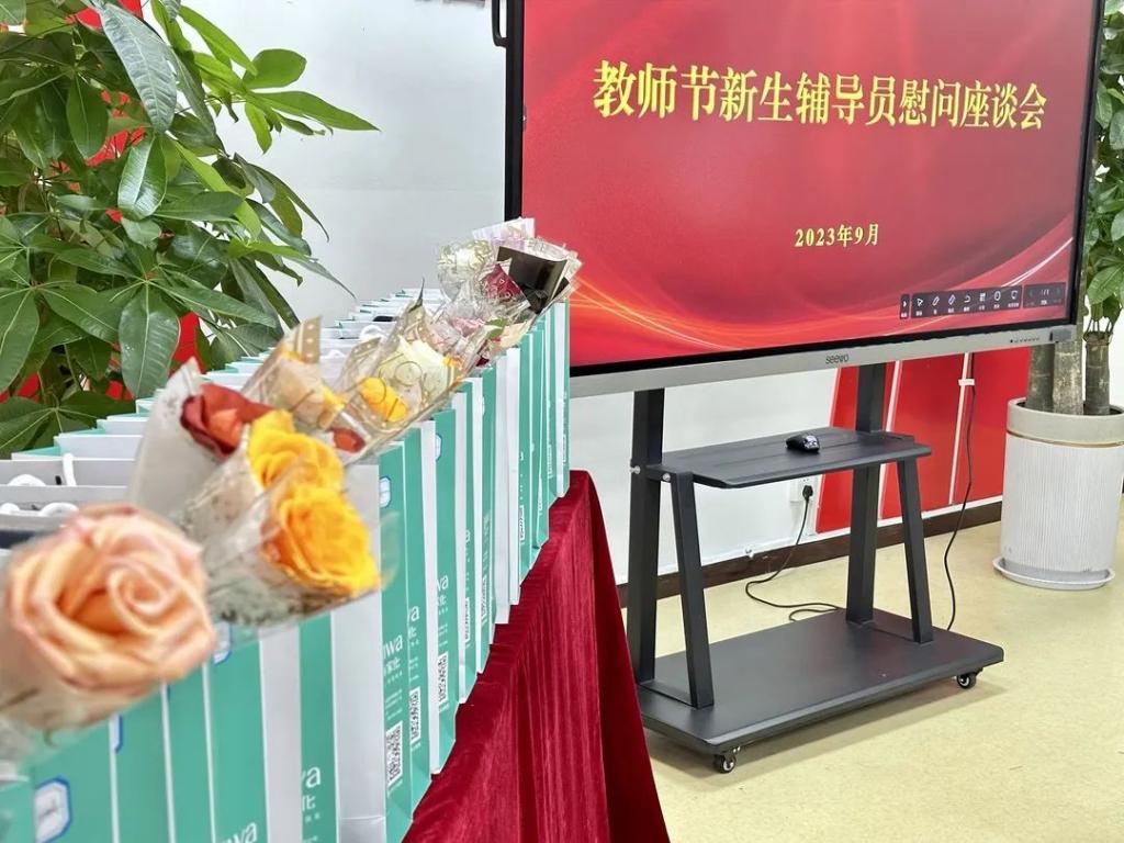9月8日上午,在第39个教师节到来之际,学校党委副书记、副校长姚文静走访慰问2023级新生辅导员们,向他们致以诚挚的问候和节日的祝福。慰问期间,姚校长为辅导员老师们送上鲜花和亲笔签名贺卡并亲切交谈,感谢他们在新生报到及军训期间的辛勤付出,希望他们做好新生健康成长的指导者和引路人。