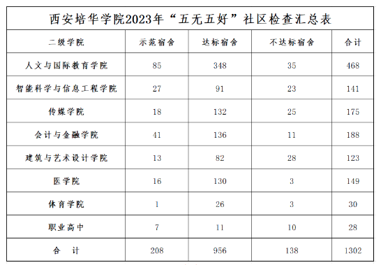 本次检查评比工作,是在各学生社区自查整改基础上开展的,总计1302间宿舍,其中“五无五好”示范宿舍208间,达标宿舍956间,不达标宿舍138间。现将本次检查的结果进行公示: