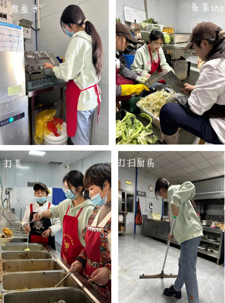 在这次活动中,刘佳欣同学亲身参与了为600多名工人做工作餐,从切菜配菜洗菜到准备好菜品后的清洁工作,再到为工人打饭菜,再到为第二天的早饭做准备——包包子、包饺子等一系列的劳动工作。