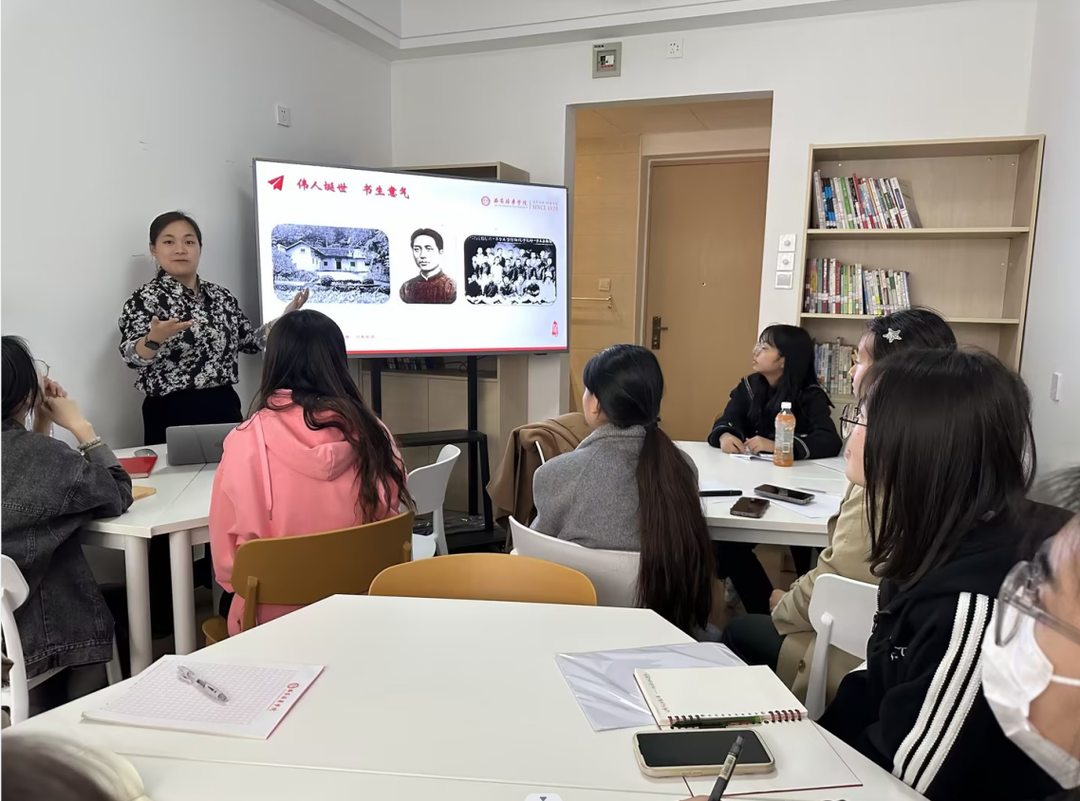 杨媛主任用“唠家常”的方式打破与同学们之间的隔阂,亲切问候参与活动的各位同学们,聊到平时是否有阅读关于毛泽东主席的作品,大多数同学们是较少的会涉及此类书籍的,接下来,杨主任介绍了毛主席的生平与学习经历,“写革命、写江山、写战友、写自己”毛主席的文笔大气磅礴,激励同学们阅读可以提升自我,延伸阅读的领域,以历史眼光探寻诗词的文化内涵。