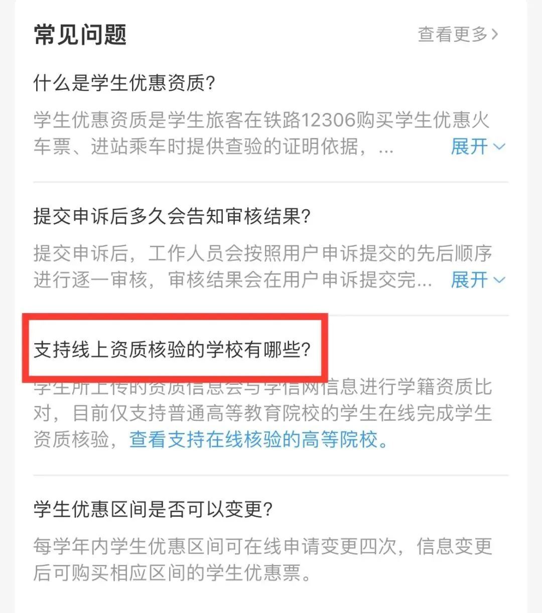 打开铁路12306APP,右下角进入“我的”页面,在学生资质填写页面的“常见问题”中,找到“支持线上资质核验的学校有哪些?”即可查看支持在线核验的学校名单。