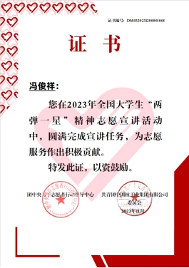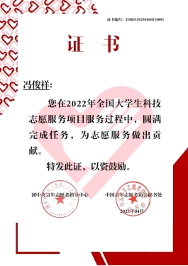 2023年4月,获得2022年团中央全国大学生科技志愿服务“荣誉证书”