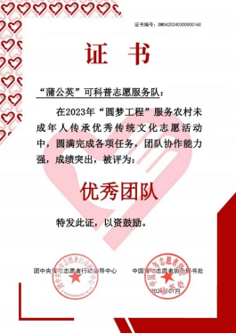 2023年6月,“蒲公英”科普志愿服务队再次成功入选成为2023年“七彩假期”志愿服务示范团队。团队以“智能+科技+辅导”为抓手,利用“辅导作业+七彩课程+七彩实验”的模式,7月,“蒲公英”科普志愿服务队再次成功入选成为2023年“圆梦工程”志愿服务示范团队。团队结合“七彩假期”项目,再以“传统文化传承的普及”为主题,以“文化+传统+辅导”为抓手,利用“系列培训+手工制作+展示表演”的模式,以丰富山区中小学生、农村留守儿童的假期生活为总目标,不断学习和提升实践能力,开展志愿服务及实践服务相关活动,为农村的孩子带来“蒲公英”般的七彩假期。