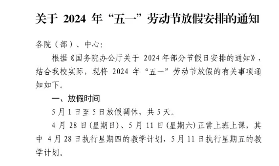 根据国务院办公厅2024 年部分节假日安排和我校校历