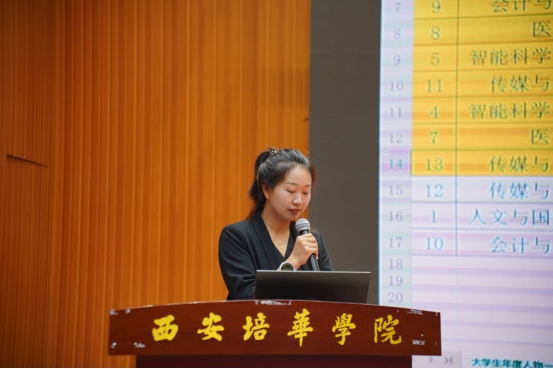 为深入学习贯彻习近平新时代中国特色社会主义思想和党的二十大精神,充分展示我校大学生坚定不移听党话、跟党走,怀抱梦想又脚踏实地的精神风貌,激励广大青年学生立志做有理想、敢担当、能吃苦、肯奋斗的新时代好青年,我校于5月9日晚上18:30在维之图书馆报告厅开展“2024年西安培华学院大学生年度人物答辩评审会”。党委学工部副部长 学生服务中心副主任杨媛,校团委书记董莹,各二级学院党委(党总支)书记(副书记)、30名大众评审以及300名学生代表参加本次大会。会议由学生服务中心黄晨老师主持。