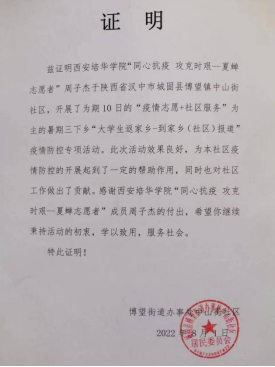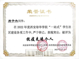 12.2023年6月,在2022年度西安培华学院“一站式”学生社区建设工作中被评为“抗疫先进个人”称号