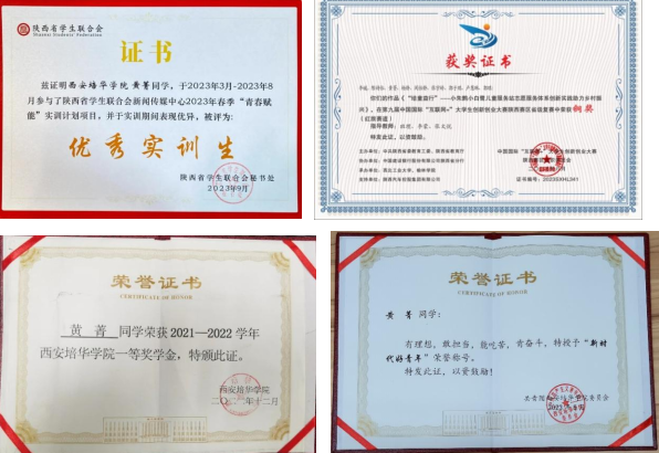 社会实践方面,在第二课堂中,黄菁同学积极参加各级各类比赛活动,大学期间共获国家级、省级荣誉7项、校级荣誉30余项;暑假期间,组织团队前往榆林米脂县,开展“粟有银州,生态米脂,青春助农”暑期三下乡社会实践,带领团队获得团中央立项两项,进入乡村基层,拍摄《银州印象》系列米脂宣传短片,以青春之声讲述米脂故事;在寒假期间,返乡后前往中共浙皖赣革命旧址,作为红色讲解员讲述着家乡故事,积极参加社会实践获评“五育并举”系列实践活动“先进个人”荣誉。志愿服务方面,在疫情期间,她积极参与公寓值班、核酸检测、校园巡逻、食堂执勤、返乡志愿等校园疫情防控志愿工作,获共青团西安培华学院委员会颁发的志愿服务证书,同时积极参与到雷锋月社区志愿服务工作当中,志愿时长超300小时。