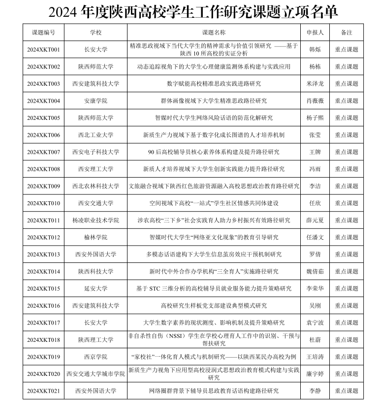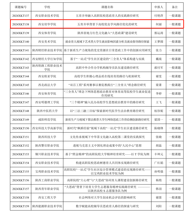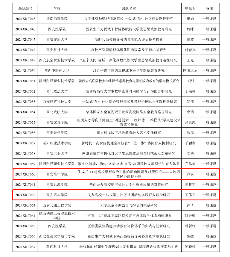 6月5日,中共陕西省委教育工委发布了《中共陕西省委教育工委关于公布2024年度陕西高校学生工作研究课题立项名单的通知》,我校医学院党委副书记何丽主持的《五育并举背景下高校优良学风路径优化的研究》、智能科学与工程学院党委副书记王伟平主持的《民办高校一站式学生社区社团活动实践育人路径研究》、传媒与设计学院辅导员乔安主持的《生成式 AI 对高校思想政治工作的影响因素及对策研究——以陕西某民办高校为例》分别获得课题项目立项。