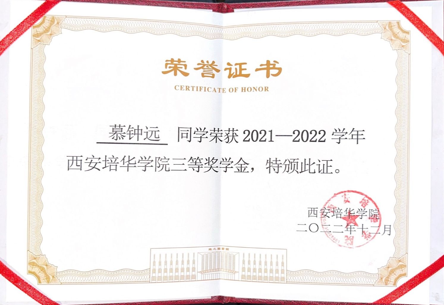 12.2022年12月获得西安培华学院三等奖学金;
