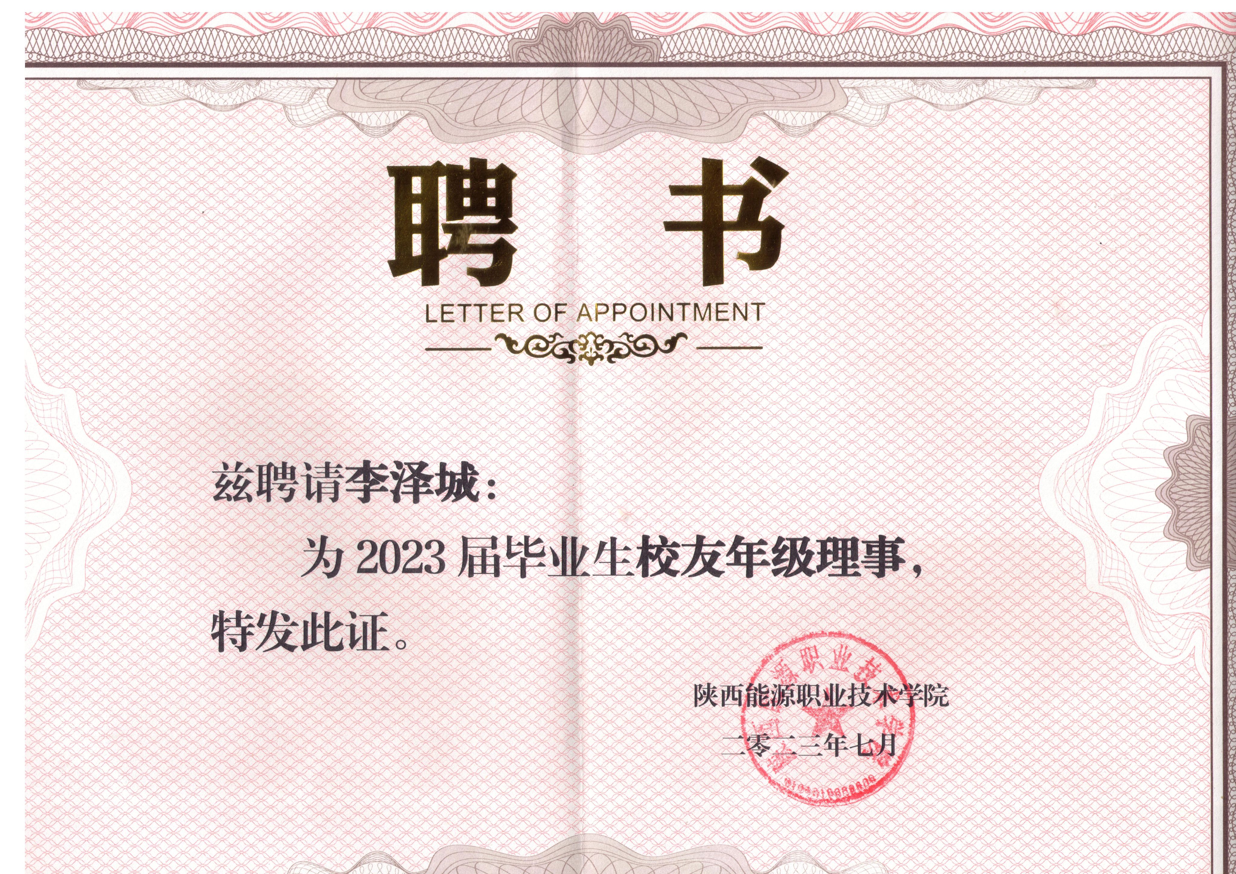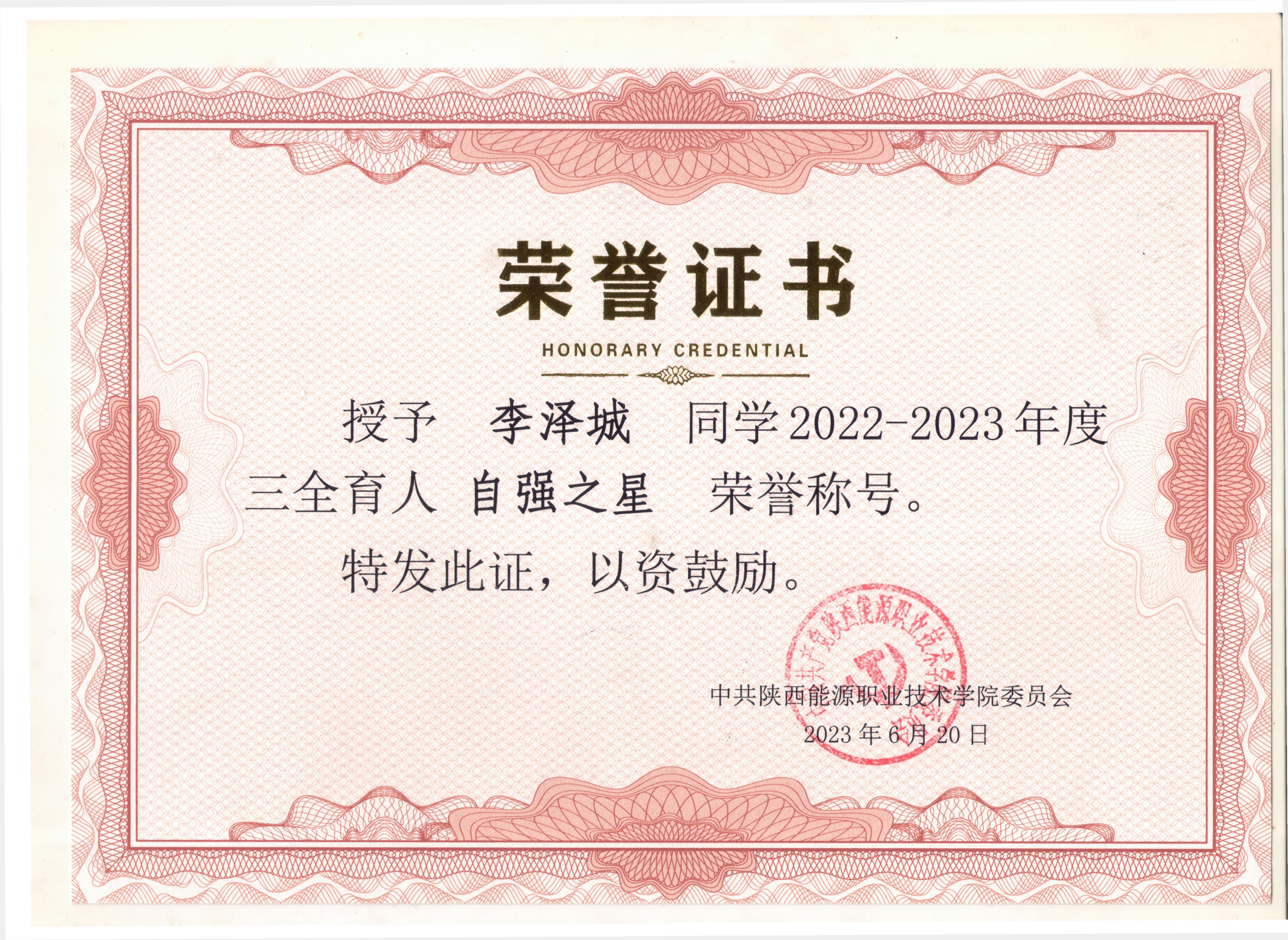 2.2023年7月获陕西省优秀学生干部荣誉称号;
