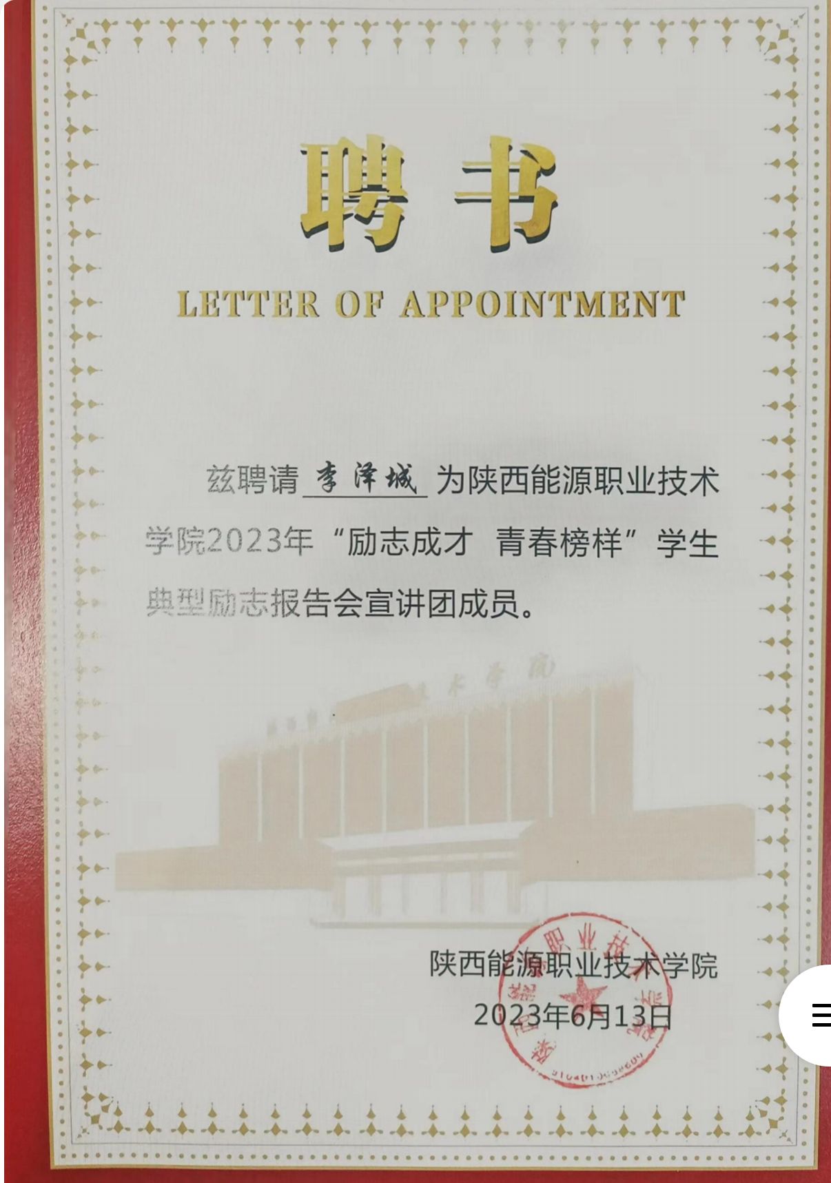 3.2023年6月被聘为陕西省国家奖学金“青春榜样说”成员;