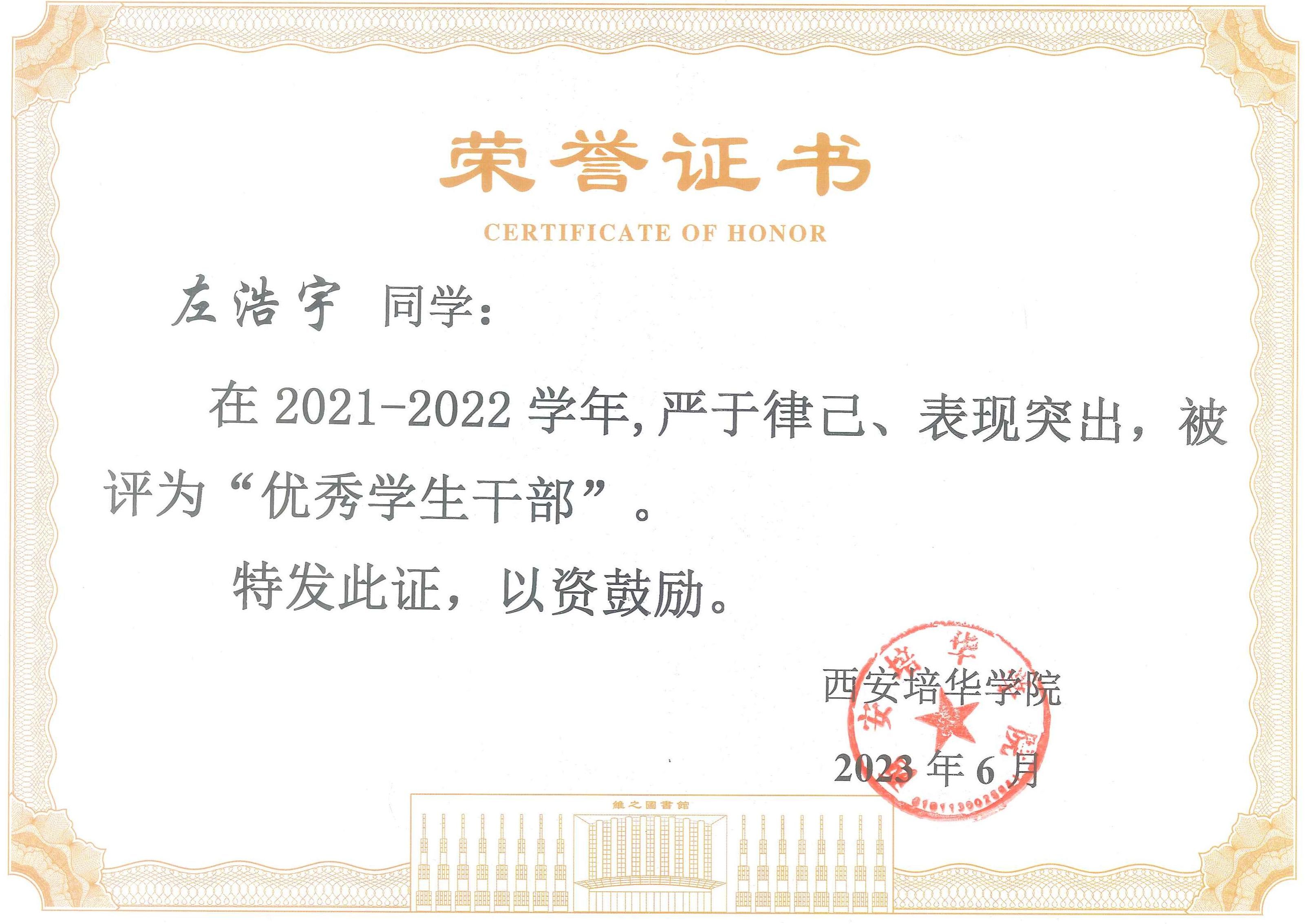左浩宇担任法学2101班班长、团支部副书记、法学院党总支学生工作部部长、法学院学生第一党支部组织委员,曾担任人文与国际教育学院学生会外联部负责人、人文与国际教育学院学生第三党支部助理。在担任班长期间,左浩宇同学积极为同学们解决问题,为老师分忧,积极协调班级总体事务,以身作则,带领同学们争优创先,所在班级荣获“姜维之班”优秀创建班级、西安培华学院先进班集体、五四红旗团支部等荣誉称号。在处理党务工作中,他认真负责,恪尽职守,高质量完成各项工作,被评为“优秀学生助理”“党务工作标兵”等。在学生会工作期间,他努力做好本职工作,发挥好身为学生干部的作用,牢记学生会工作人员的准则,被评为“优秀学生干部”。在校园工作中,他积极热情,锐意进取,虚心向别人学习,随时进行批评与自我批评,做到有错就改,始终以“服务同学,锻炼自己”为宗旨,真正做到为同学服务,为校园建设添砖加瓦。