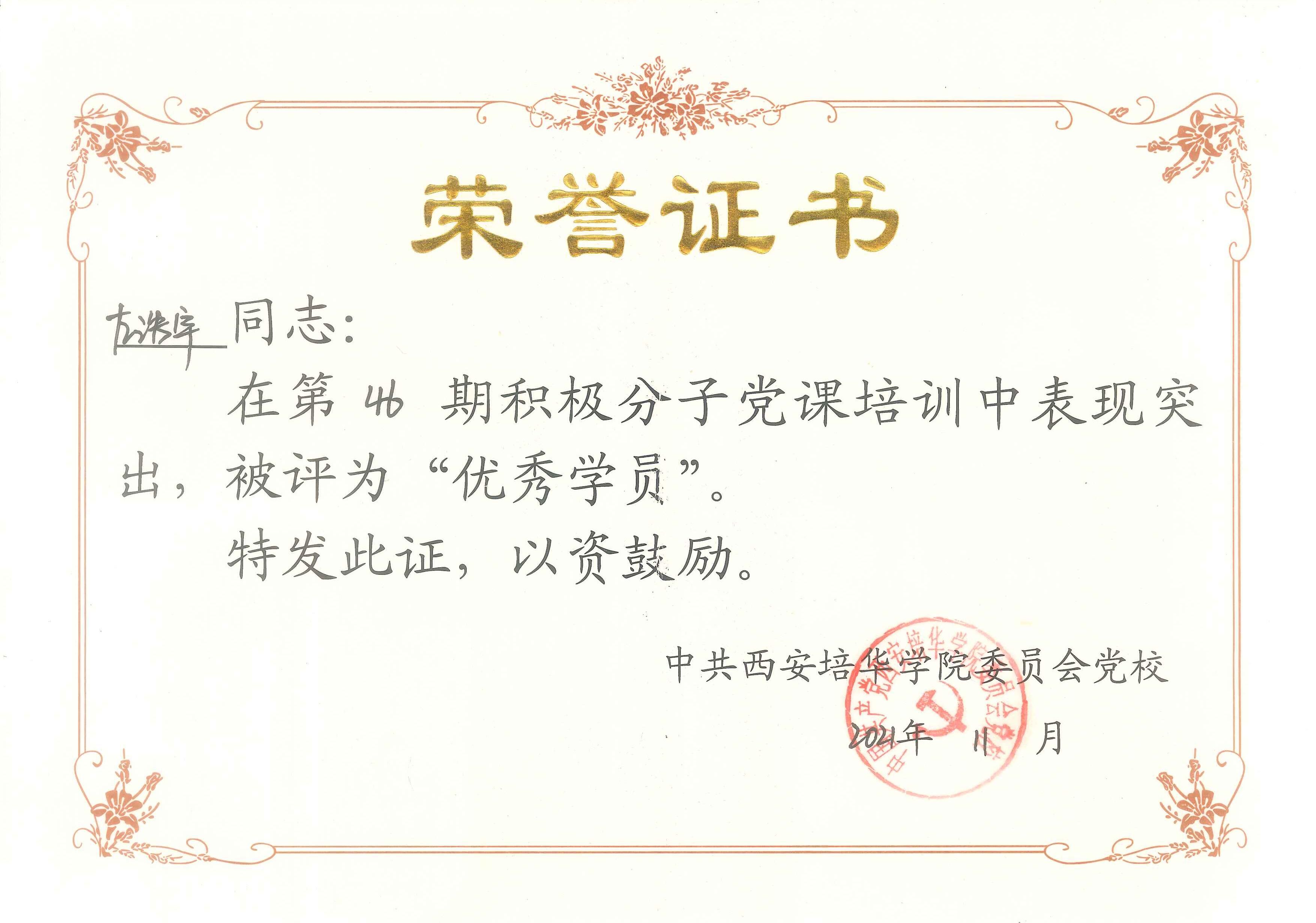 左浩宇理想信念坚定,自强向上,爱党爱国,树立了良好的人生观和道德观,始终保持与时俱进,在严格要求自己的同时,还在不断鼓励、帮助身边的同学。他平日里积极学习党的思想,关注国家时事政策,能够积极主动参加党纪学习教育,立志用自己所学专业知识为新时代法治建设贡献力量。先后被评为2021年中共西安培华学院委员会党校第46期积极分子培训“优秀学员”、优秀共青团员、新时代好青年、党员之星、优秀共产党员等。