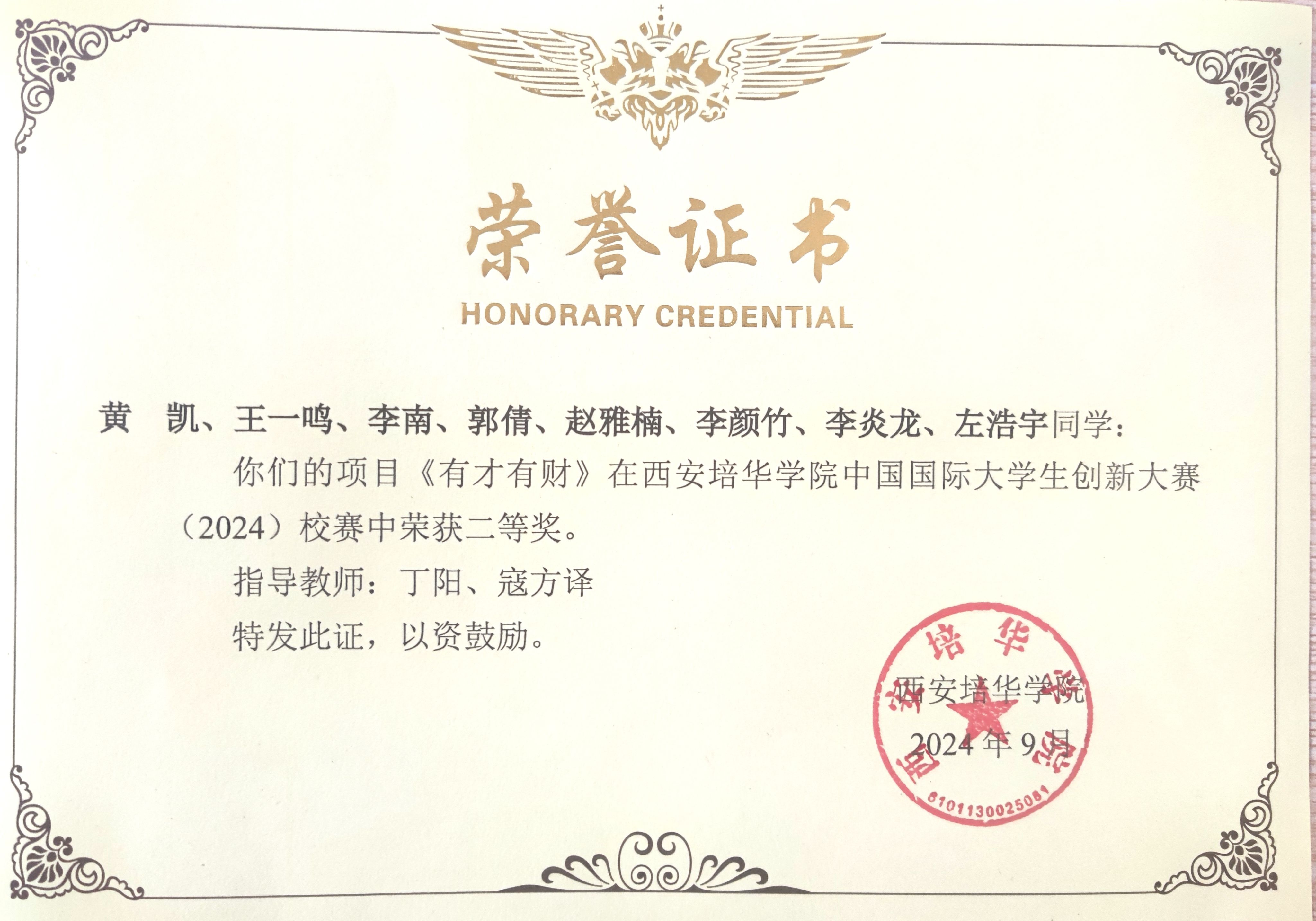 2.2024年中国国际大学生创新大赛《有“才”有“财”》项目获陕西赛区省级铜奖、校赛二等奖;