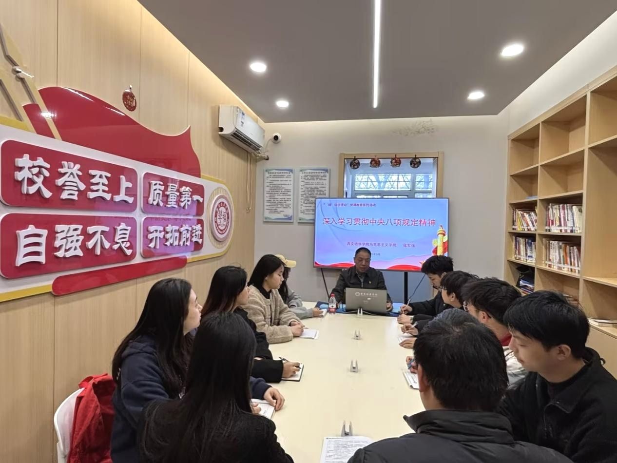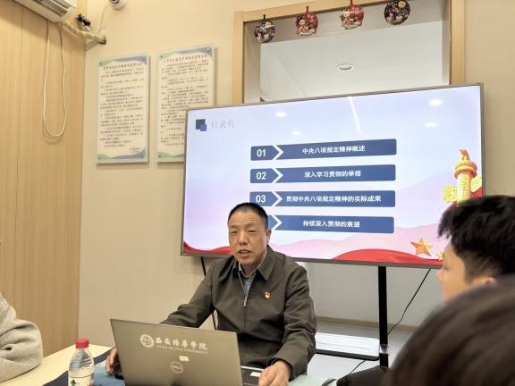 为学习贯彻全国两会精神,党中央决定,自2025年全国两会后至7月,在全党开展深入贯彻中央八项规定精神学习教育。3月21日,马克思主义学院副院长、党总支书记寇军强在明德学生社区党团活动室为学生开展了“深入学习贯彻中央八项规定精神”学习教育微党课。