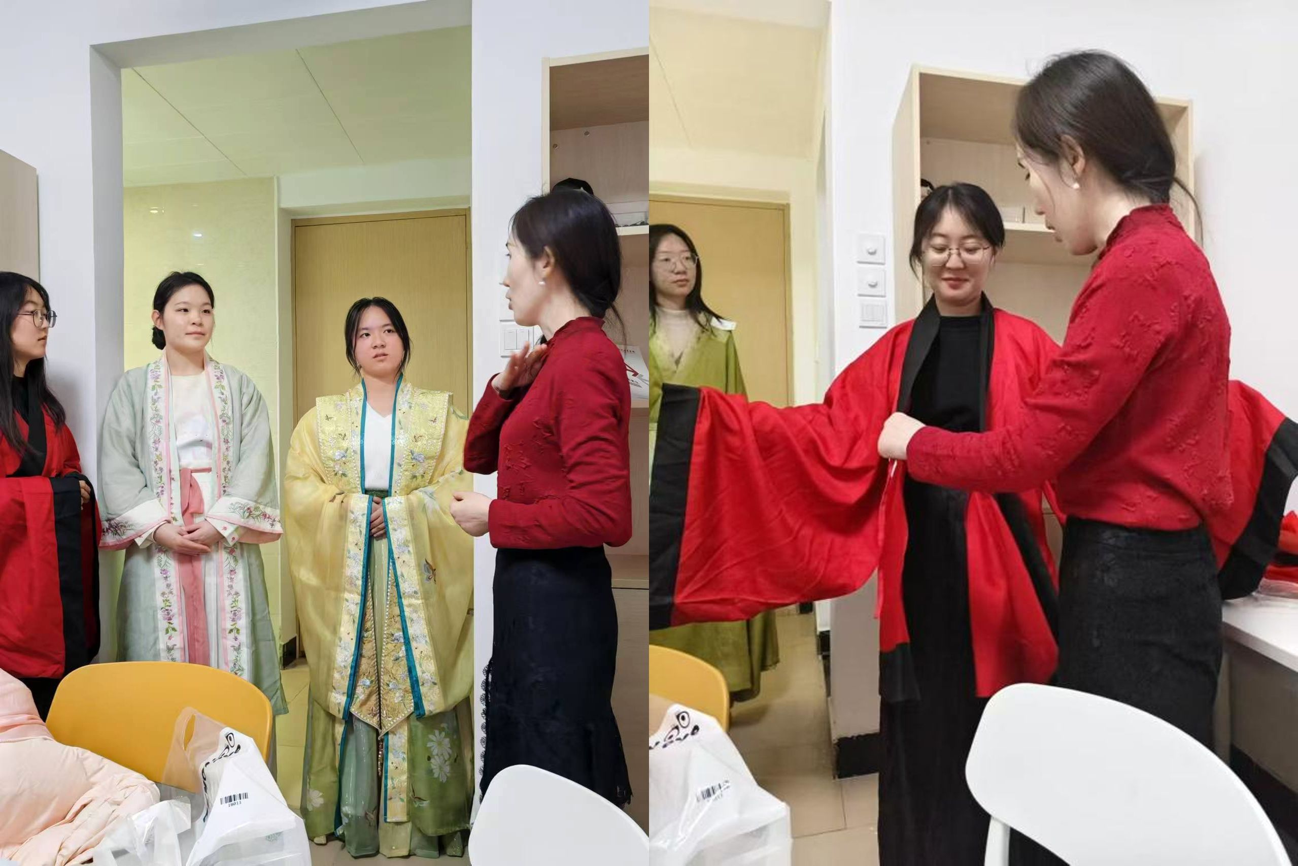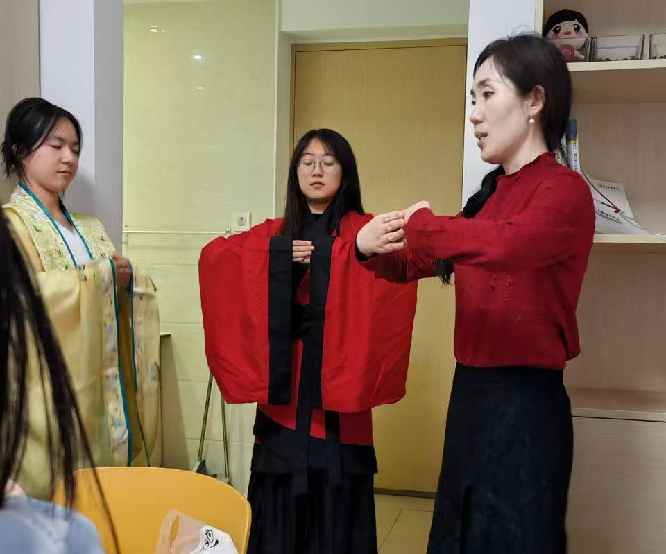 汉服是汉民族传承四千多年的传统民族服装,具有独特的汉民族风貌性格,明显区别于其他民族的传统服装和配饰体系。博雅学生社区学业导师张萍从用料、结构特点和裾的长度等方面为学生详细讲解汉服文化,特别强调了交领右衽的穿着要领。