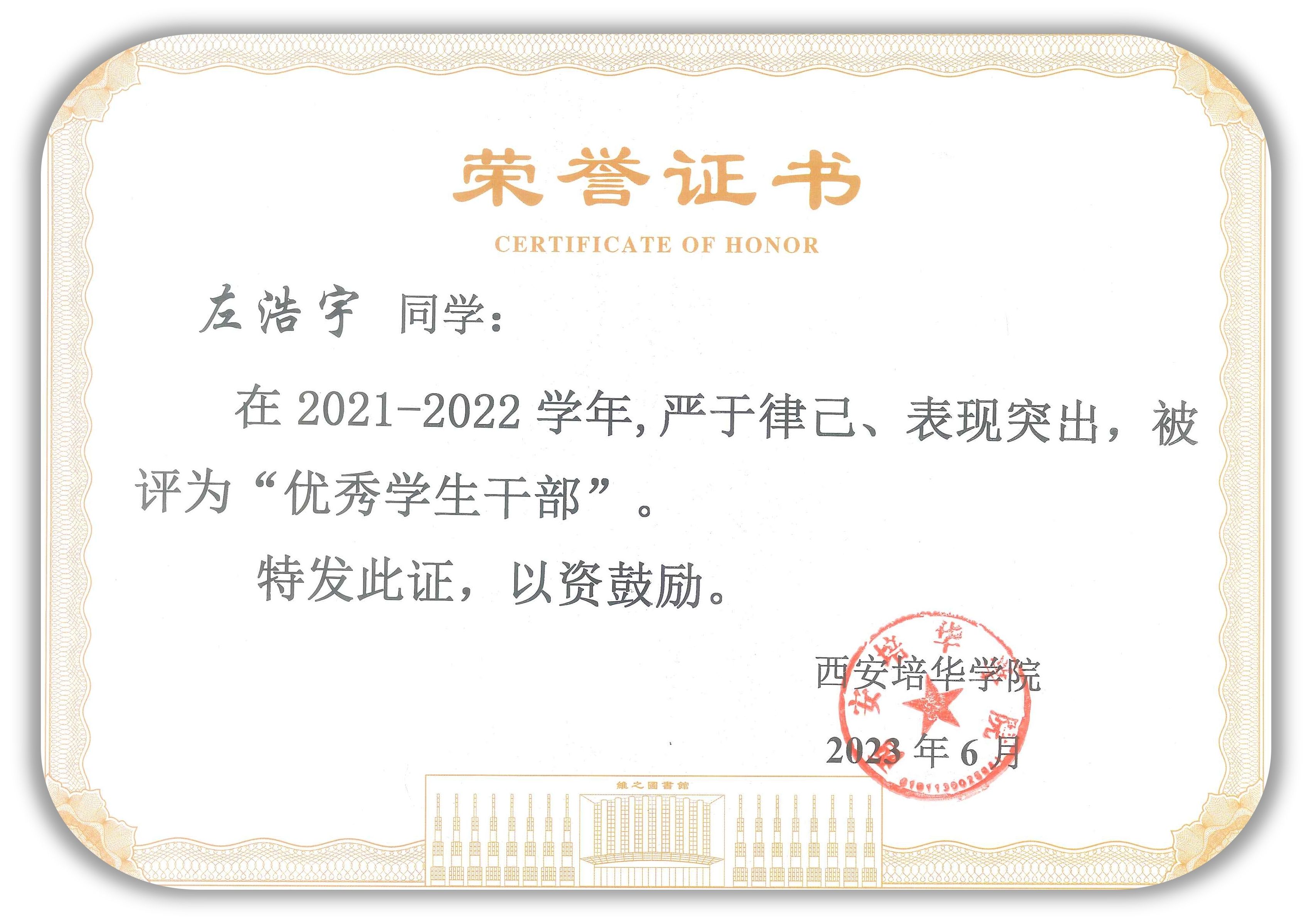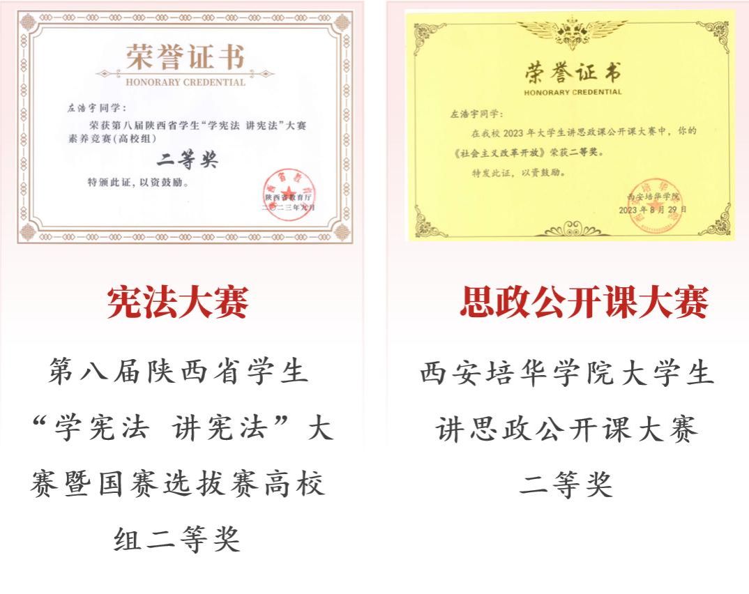 在课余他积极参与各类竞赛,通过竞赛,不断挑战自我,突破自我,将所学知识转化为解决实际问题的能力。在第八届陕西省学生“学宪法 讲宪法”大赛暨国赛选拔赛中他荣获高校组二等奖,总分第二名,为培华取得了历届以来最好的一次成绩。在西安培华学院大学生讲思政公开课大赛中荣获二等奖。参加西安培华学院第十五届“名花有主”求职大赛荣获校级总决赛三等奖。西安培华学院首届大学生职业规划大赛(就业赛道)三等奖。所参与的中国国际大学生创新大赛《有“才”有“财”》项目获陕西赛区省级铜奖、校赛二等奖,《孟孟体育:一家只做中考体育的训练营》项目获校赛二等奖,大学生创新训练计划《以酒为媒——传承酒海技艺》项目获省级立项、推荐为国家级立项。
