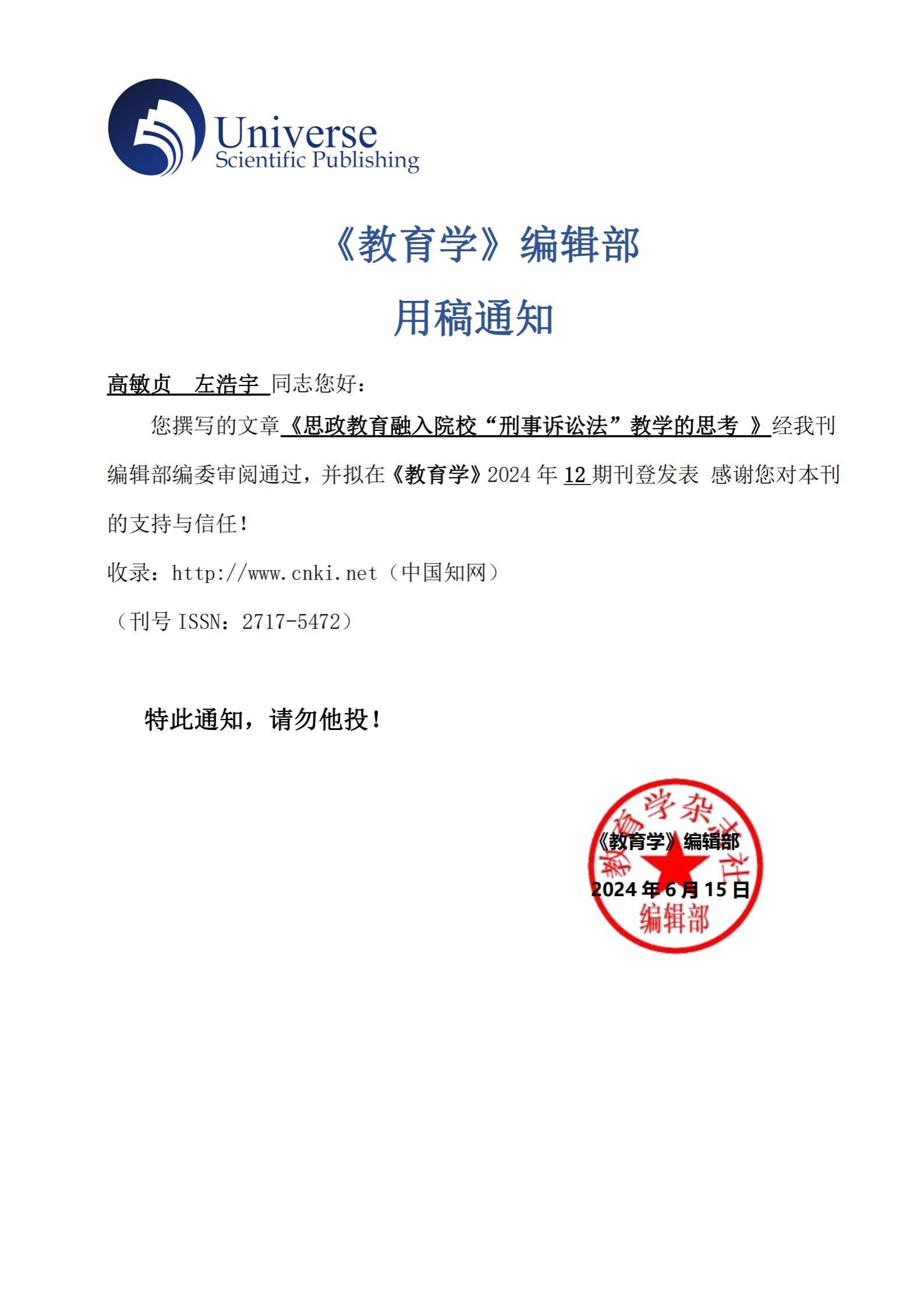 法学是实践的科学,他坚信法学教育的目的在于培养能够服务社会的法律人才,因此,积极参与各类的实践活动,努力做到理论与实践相结合。在假期他参加暑期“三下乡”活动,跟随所在团队“破毒行动队”前往陕西省咸阳市淳化县开展一系列普法宣传活动,取得良好效果,所在团队“破毒”行动队荣获学校社会实践活动优秀团队荣誉称号。跟随法学专业教师前往西安“一带一路”国际商事法律服务示范区,开展相关调研活动,开阔了国际视野,提升了专业能力。作为学生代表参加陕西省预防青少年犯罪研究会第三次代表大会,应台州市人才服务中心邀请前往浙江省台州市进行大学生就业情况调研。在校内,他也积极参加了各类志愿服务活动。这些实践经历不仅丰富了我的大学生活,也坚定了未来从事法律事业的决心。在科研领域,他秉持着严谨求实的态度,积极投身于法学研究之中。关注社会热点问题,结合所学专业知识进行深入探索和分析,在老师的辛勤指导下,参与了多项科研项目,以第一作者身份在《医学研究》期刊发表专业论文1篇,以第二作者身份在《教育学》期刊发表专业论文1篇。