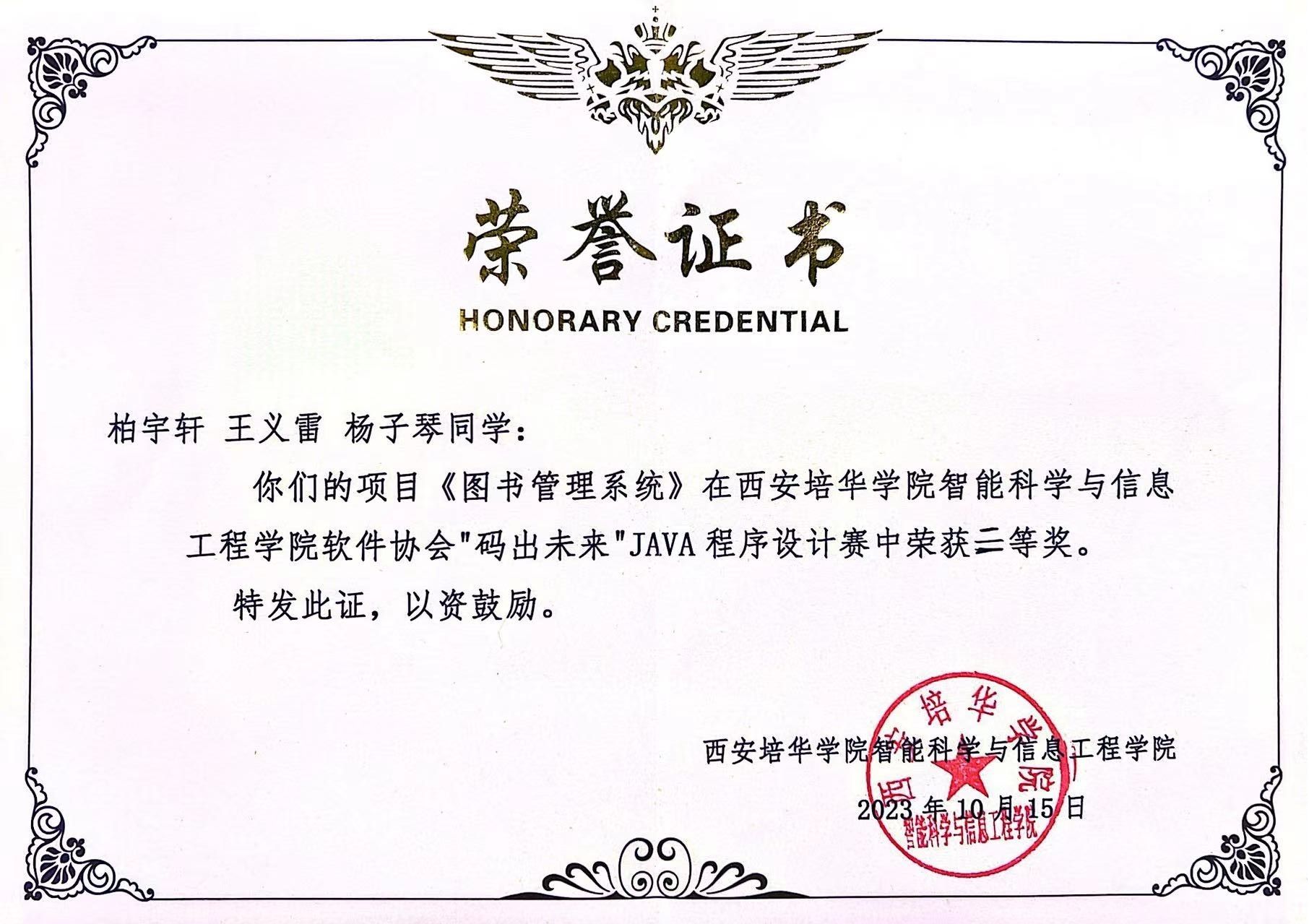 柏宇轩,智能科学与工程学院计算机科学与技术本科生,现担任西安培华学院软件协会会长,西安培华学院创客中心科技创新实验室学生负责人,2023级计算机科学与技术专业专业学长,计算机科学与技术2203班生活委员。力学笃行,学业水平优异,曾获2022-2023学年西安培华学院一等奖学金,西安培华学院三好学生称号。竞赛成果丰富,曾获“互联网+”创新创业大赛陕西赛区铜奖4项,校级奖项5项,计算机设计大赛西北赛区二等奖1项、三等奖2项,蓝桥杯大赛省级二等奖,华为ICT大赛省级二等奖,新华三杯西北赛区省级一等奖,计算机能力挑战赛省级三等奖,校企协同大赛全国三等奖,语言文字能力大赛初赛二等奖,决赛优秀奖。青衿之志,履践致远科研成果丰富,取得中华人民共和国计算机软件著作权4项,中国知网发表论文1篇,获得大学生创新创业项目国家级立项1项,省级立项1项,参与教师校级科研项目研究1项,参与西安培华学院产学研合作项目3项。积极考取各类资格证书,通过CET-4考试,取得华为HCIA 认证ICT工程师资格证书,HarmonyOS应用开发者基础认证,西安培华学院创新创业训练营结业证书,普通话测试证书等,积极参加各类社会实践,暑期三下乡社会实践项目获团中央立项1项,展现新时代青年的责任担当。