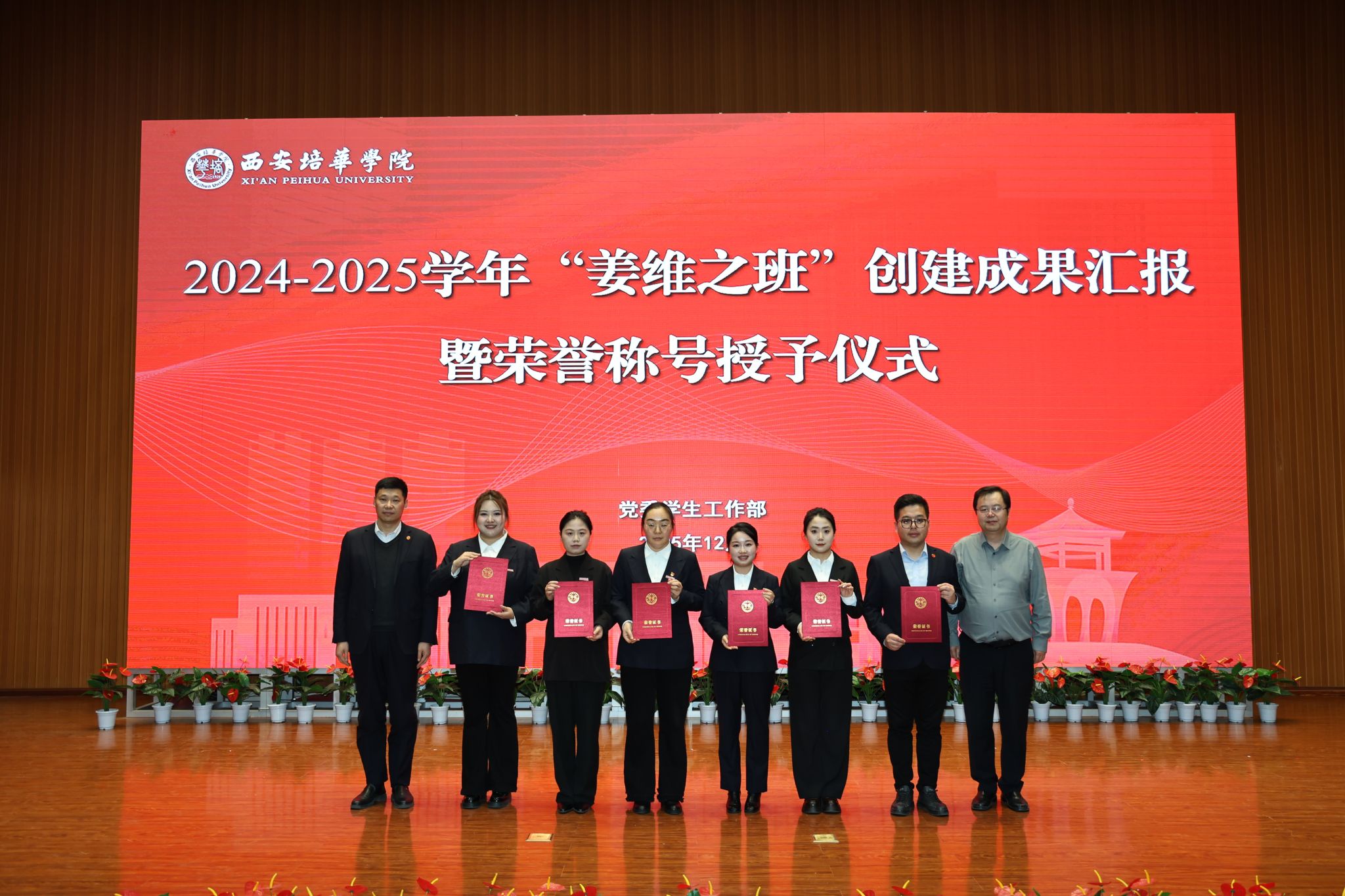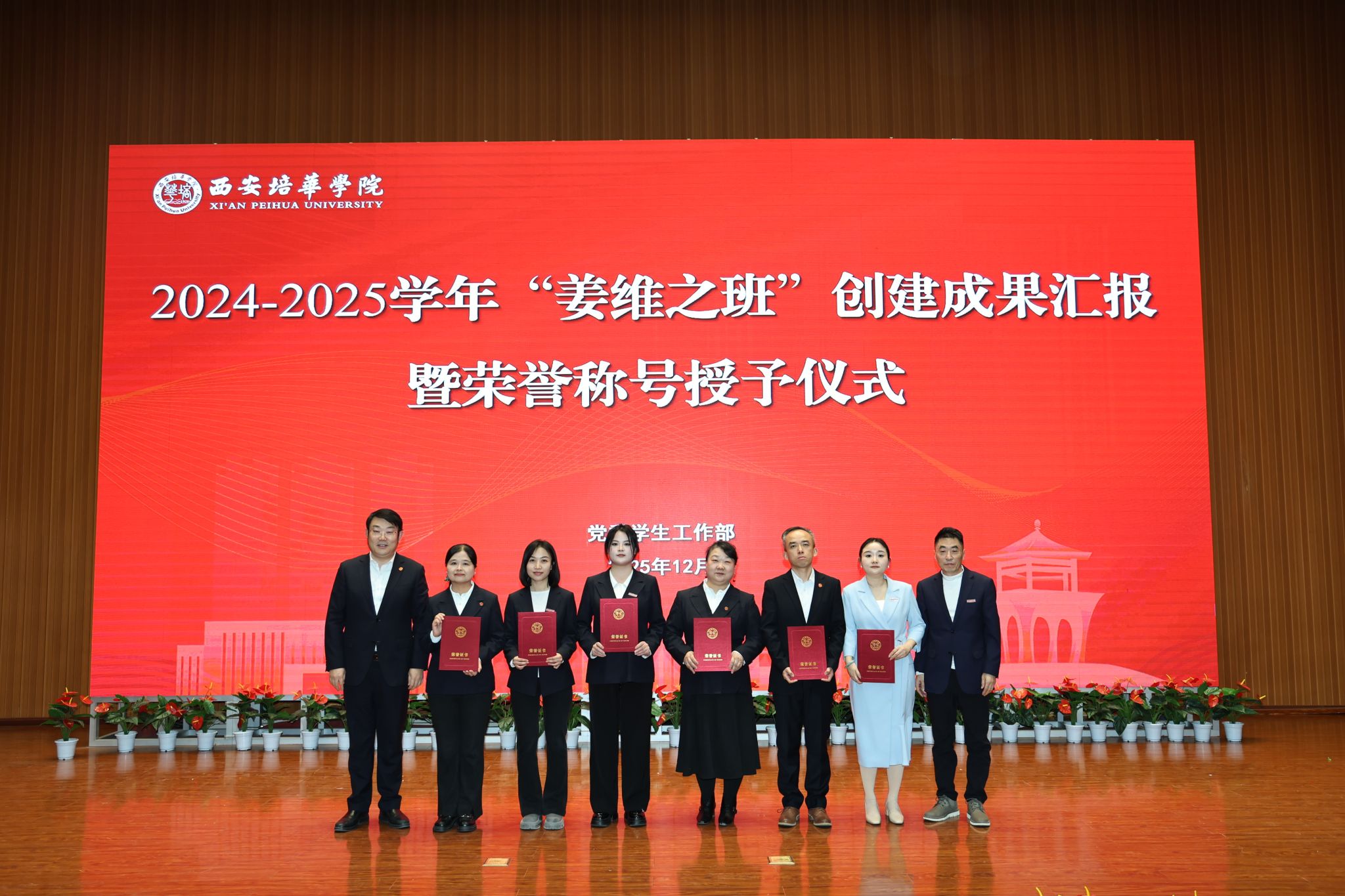 12月24日,2024-2025学年“姜维之班”创建成果汇报暨荣誉授予仪式在维之图书馆报告厅举行。西安培华学院理事长姜波,校长李映方,常务副校长胡俊生,副校长、党委副书记姚文静,理事会秘书长、副校长姜瀛初,校长助理鲍伟,党委副书记蔡亮,教务管理中心主任铁卫、各二级学院党委(党总支)书记(副书记),学业导师代表,全体辅导员,50名大众评审及培华青年共同感受优秀班集体的成长历程,见证集体闪耀,共襄荣光。