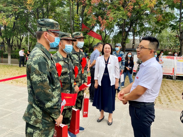 传媒学院党委书记、行政副院长江俊瑞,建筑与艺术设计学院党委书记、行政副院长权勇太,会计与金融学院党委书记、行政副院长史立军,医学院党委副书记何丽,为各自学院的新兵送上入伍纪念品及祝福。