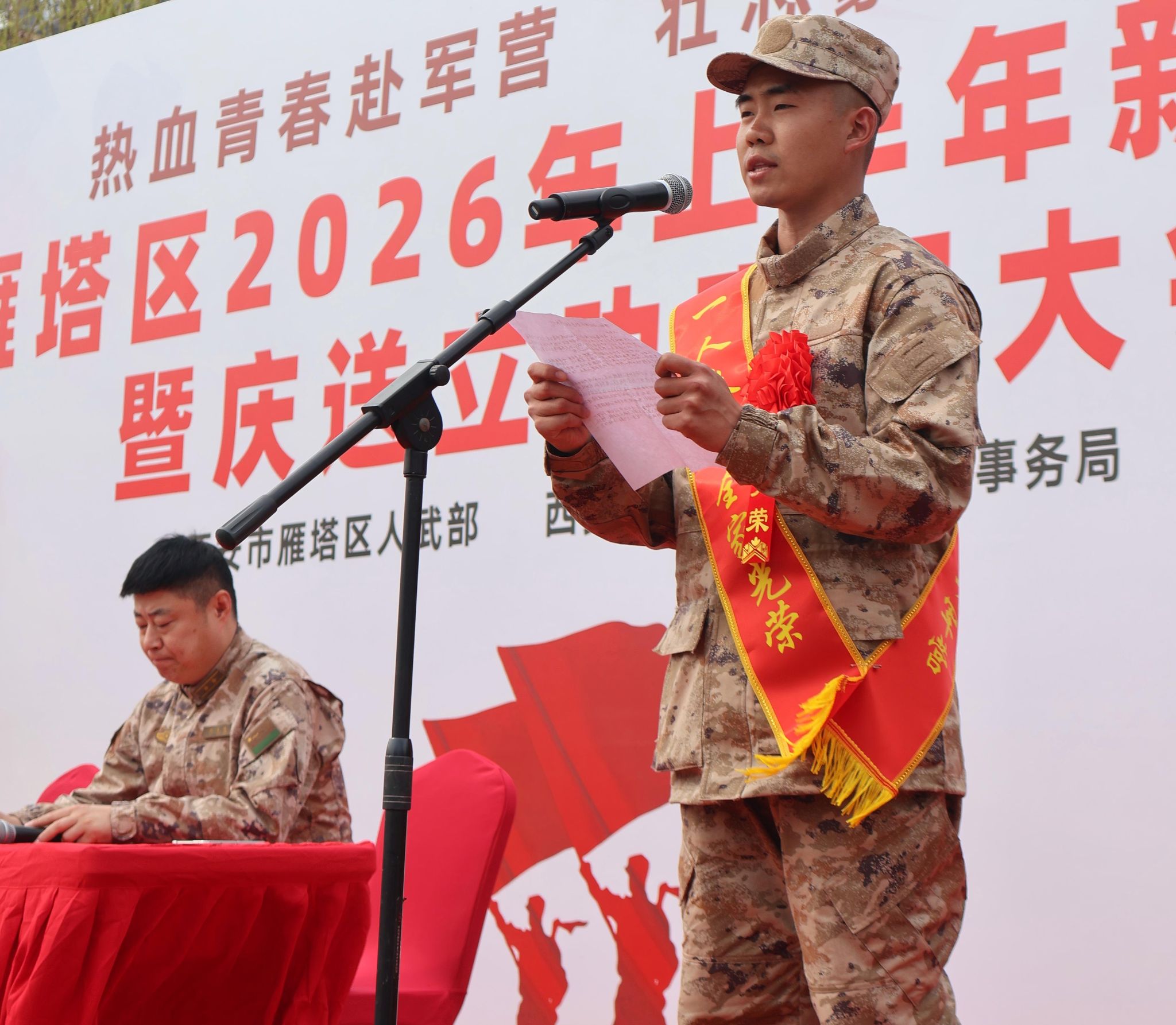 我校传媒与设计学院学生佟德鑫,在本次雁塔区新兵入伍欢送暨庆送立功喜报大会上,代表全区入伍新兵发言。他表示,作为新时代青年,要生逢盛世,更应勇担使命。今后,将牢记保家卫国的初心使命,把个人理想融入国防事业,以坚定的理想信念筑牢思想根基;将严守军队铁的纪律,绝对服从命令、听从指挥,锤炼过硬作风;将发扬不怕苦、不怕累的精神,刻苦训练、潜心钻研,努力提升军事本领,敢闯敢拼、勇当标兵;将始终心系母校、情系故里,牢记母校的教诲,不负家乡的期望,用热血与汗水书写青春无悔的军旅答卷,争取早日建功军营、载誉归来,为母校争光、为家乡添彩!