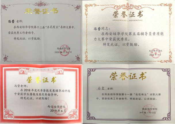 冯窦菲,女,中共党员,讲师,现任人文与国际教育学院学生干事。国家心理咨询师三级、健康管理师三级,一直从事学生思想政治教育和大学生心理健康教育工作。担任《大学生心理健康教育》《生涯规划与体验教育》课程教师。荣获第六届陕西省高校优秀辅导员、全国大学生创新促进就业(简历设计)大赛全国优秀指导教师、第四届陕西高校心理健康教育优秀教案一等奖、陕西省“心相遇 爱同行——心理健康教育伴我成长”主题征文优秀指导教师、校级大学生心理健康教育课程大赛二等奖、西安培华学院第六届中国国际“互联网+”大学生创新创业优秀指导老师、西安培华学院第十二届“名花有主”求职大赛优秀指导老师、西安培华学院巾帼建功标兵等多项荣誉称号。