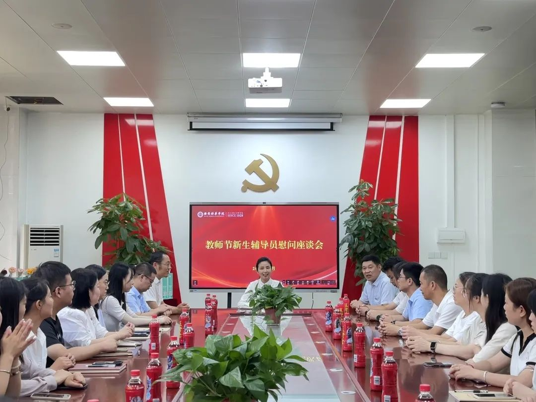 9月8日上午,在第39个教师节到来之际,学校党委副书记、副校长姚文静走访慰问2023级新生辅导员们,向他们致以诚挚的问候和节日的祝福。慰问期间,姚校长为辅导员老师们送上鲜花和亲笔签名贺卡并亲切交谈,感谢他们在新生报到及军训期间的辛勤付出,希望他们做好新生健康成长的指导者和引路人。