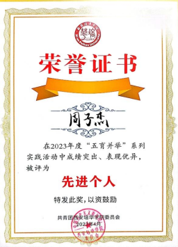 14.2023年4月,在2023年度“五育并举”系列实践活动被评为“先进个人”称号
