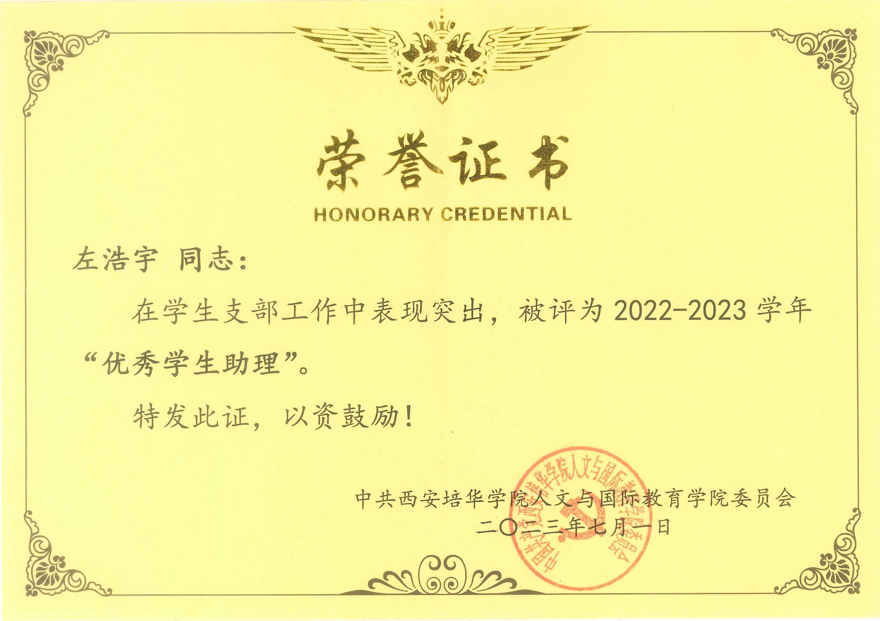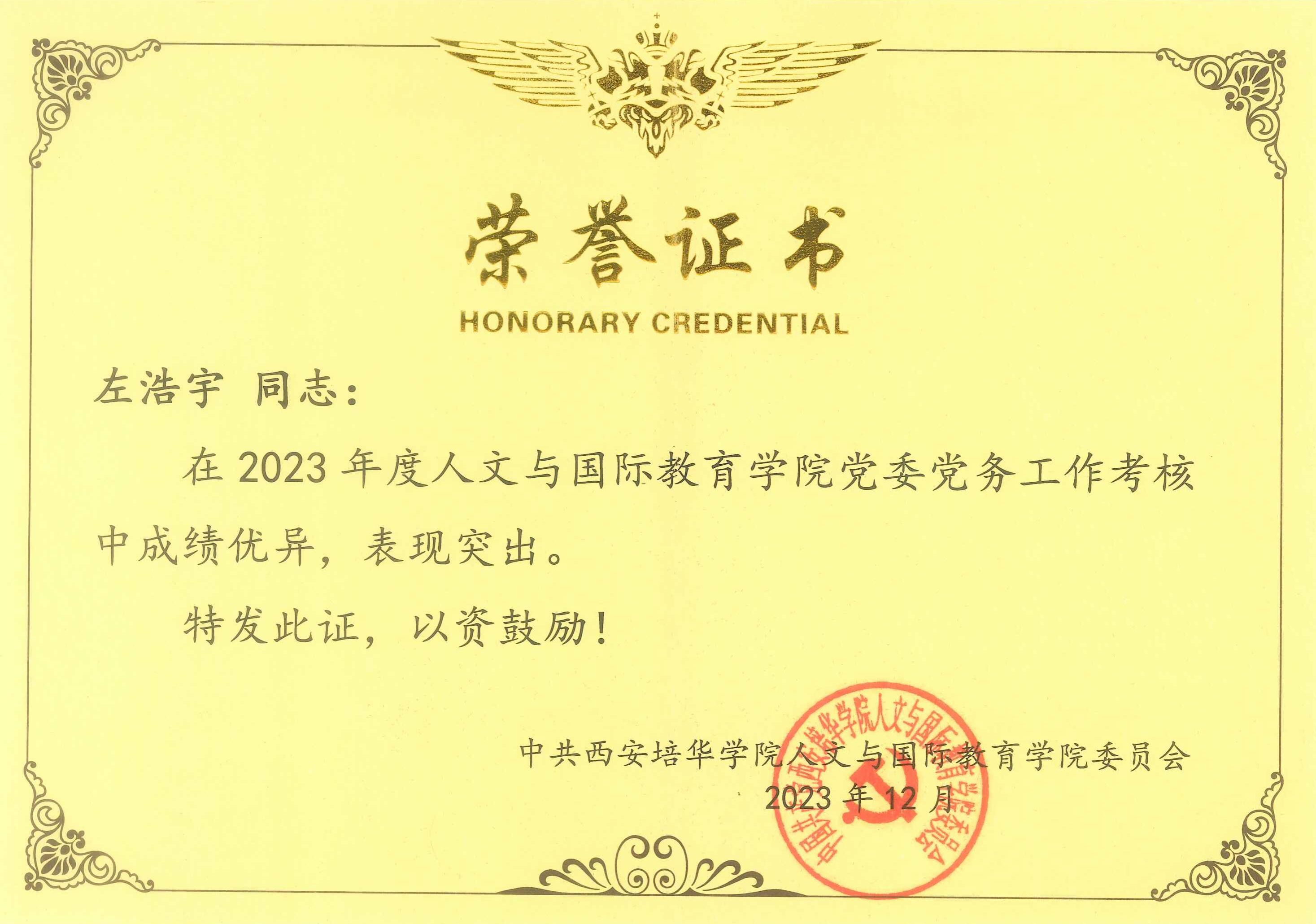 左浩宇理想信念坚定,自强向上,爱党爱国,树立了良好的人生观和道德观,始终保持与时俱进,在严格要求自己的同时,还在不断鼓励、帮助身边的同学。他平日里积极学习党的思想,关注国家时事政策,能够积极主动参加党纪学习教育,立志用自己所学专业知识为新时代法治建设贡献力量。先后被评为2021年中共西安培华学院委员会党校第46期积极分子培训“优秀学员”、优秀共青团员、新时代好青年、党员之星、优秀共产党员等。
