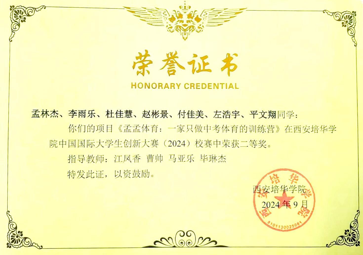 1.2024年中国国际大学生创新大赛《孟孟体育:一家只做中考体育的训练营》项目获校赛二等奖;