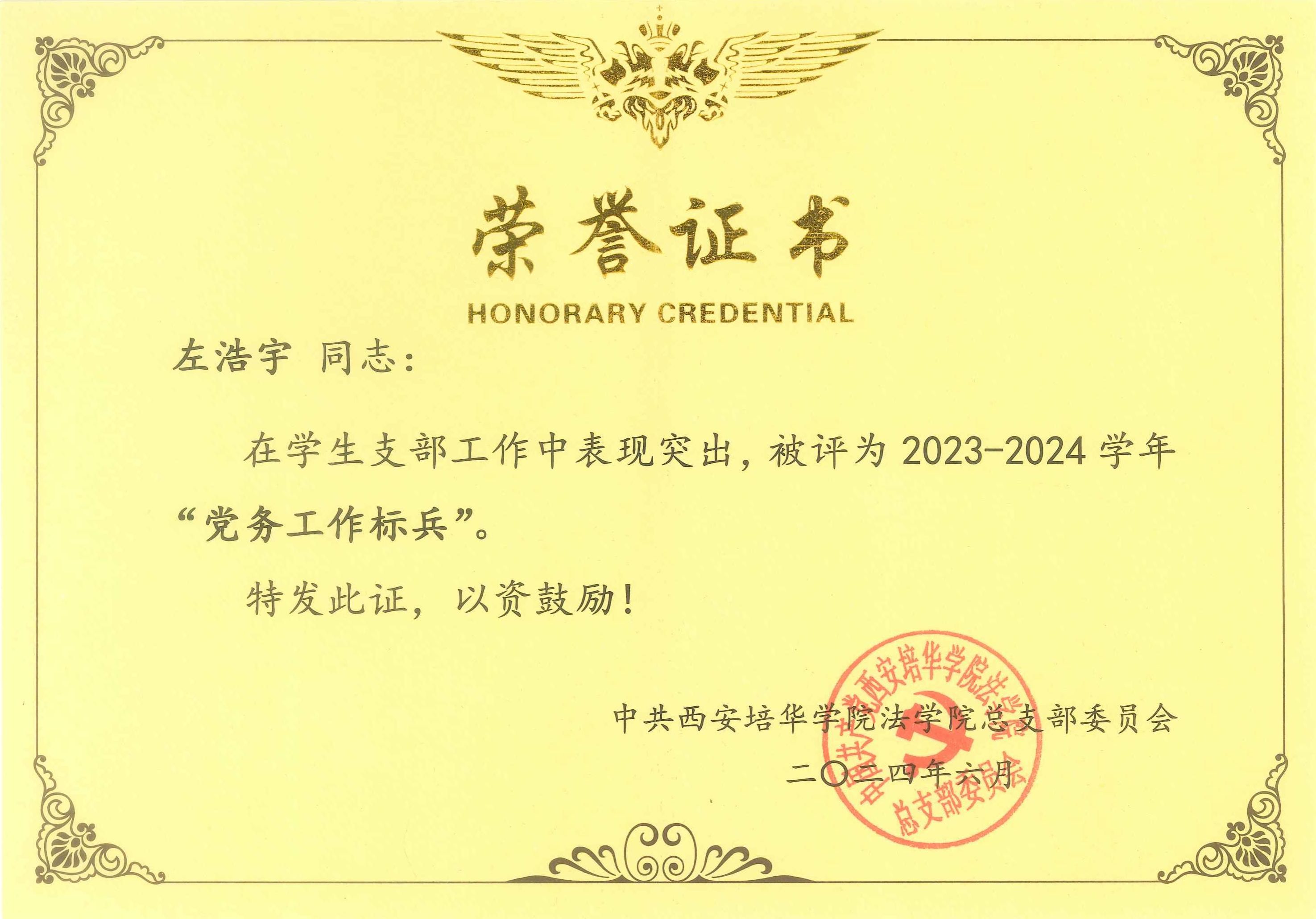 左浩宇担任法学2101班班长、团支部副书记、法学院党总支学生工作部部长、法学院学生第一党支部组织委员,曾担任人文与国际教育学院学生会外联部负责人、人文与国际教育学院学生第三党支部助理。在担任班长期间,左浩宇同学积极为同学们解决问题,为老师分忧,积极协调班级总体事务,以身作则,带领同学们争优创先,所在班级荣获“姜维之班”优秀创建班级、西安培华学院先进班集体、五四红旗团支部等荣誉称号。在处理党务工作中,他认真负责,恪尽职守,高质量完成各项工作,被评为“优秀学生助理”“党务工作标兵”等。在学生会工作期间,他努力做好本职工作,发挥好身为学生干部的作用,牢记学生会工作人员的准则,被评为“优秀学生干部”。在校园工作中,他积极热情,锐意进取,虚心向别人学习,随时进行批评与自我批评,做到有错就改,始终以“服务同学,锻炼自己”为宗旨,真正做到为同学服务,为校园建设添砖加瓦。