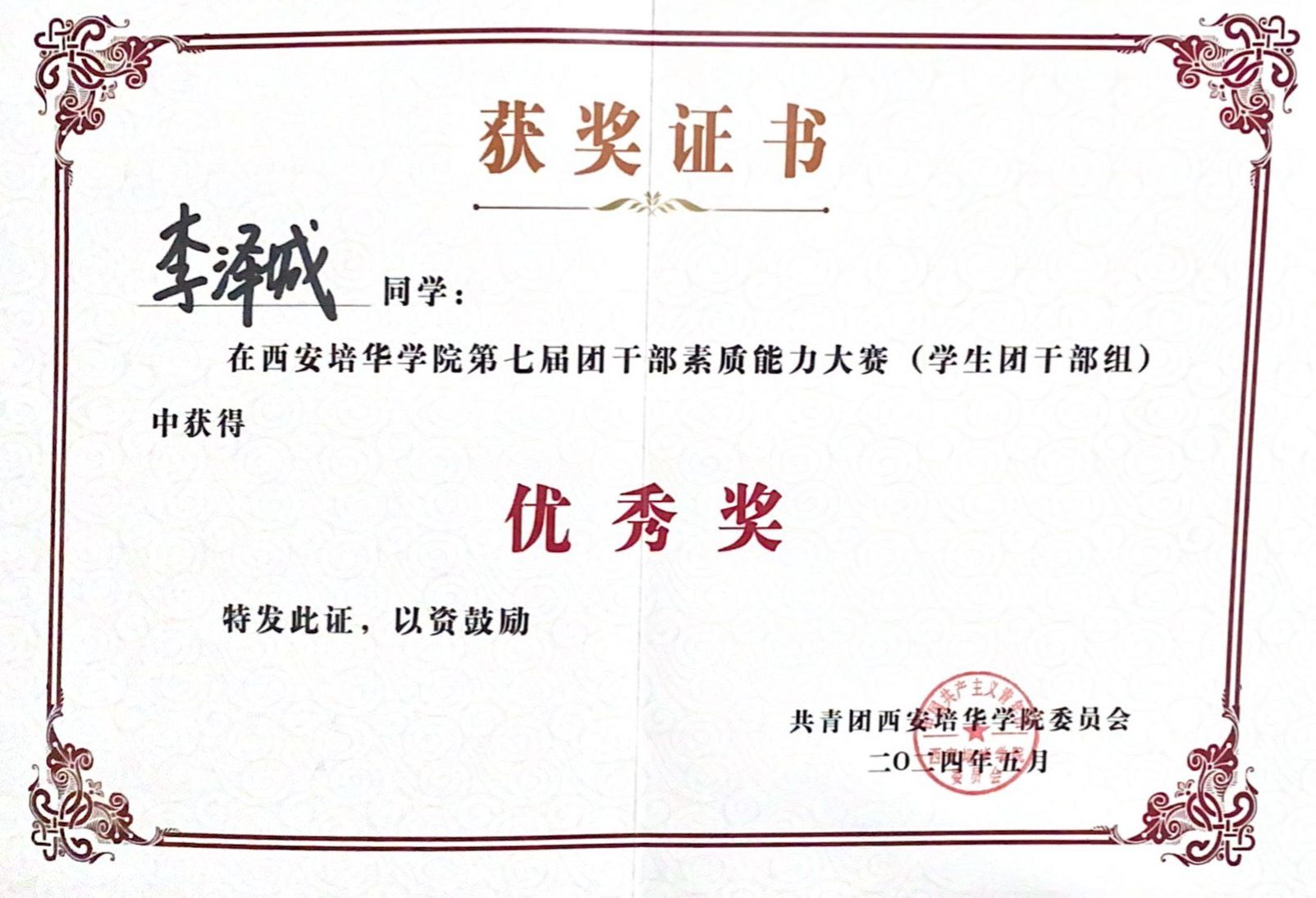 2.2024年5月获西安培华学院团干部素质能力大赛优秀奖;