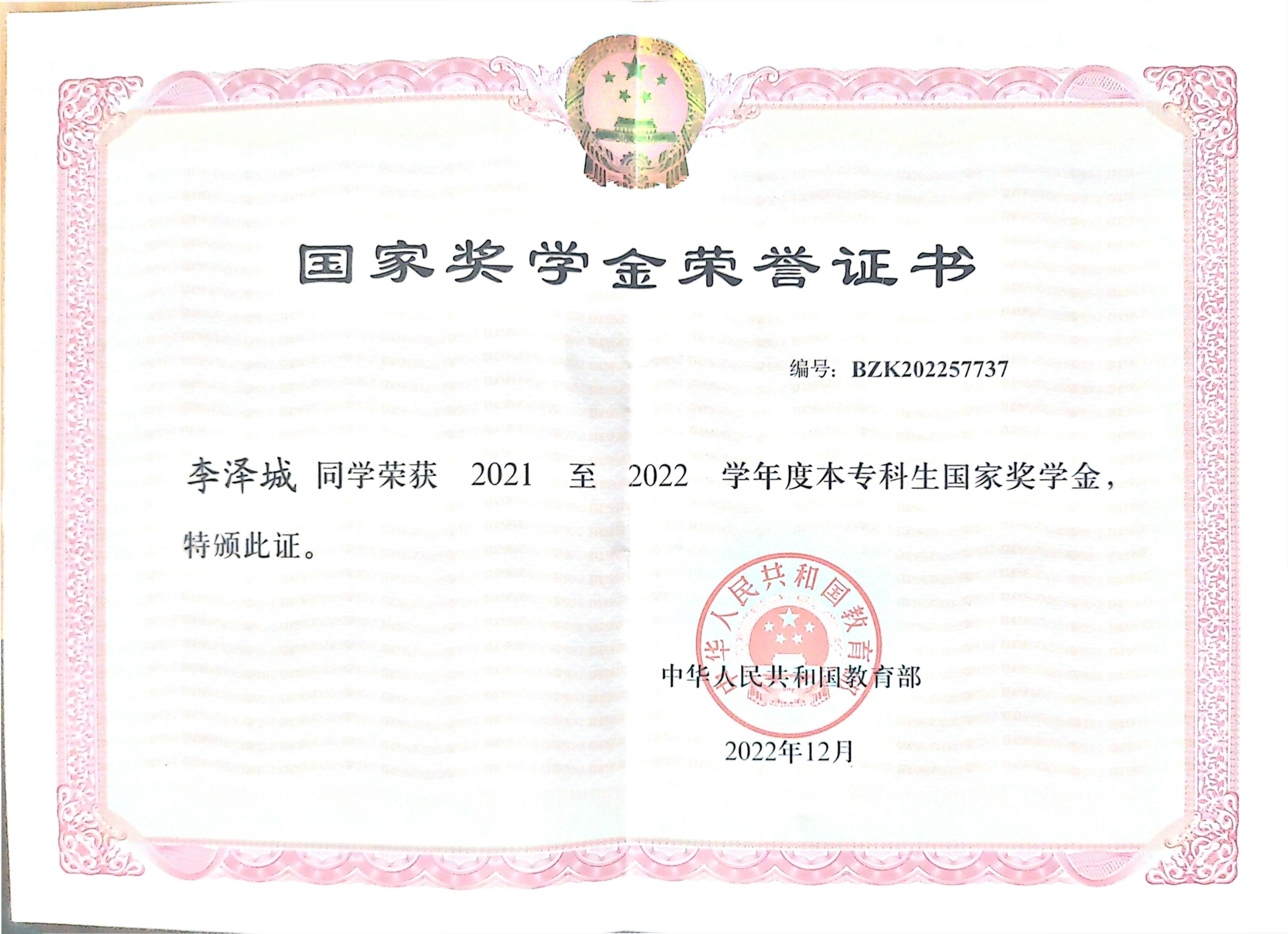 3.2022年12月获国家奖学金;