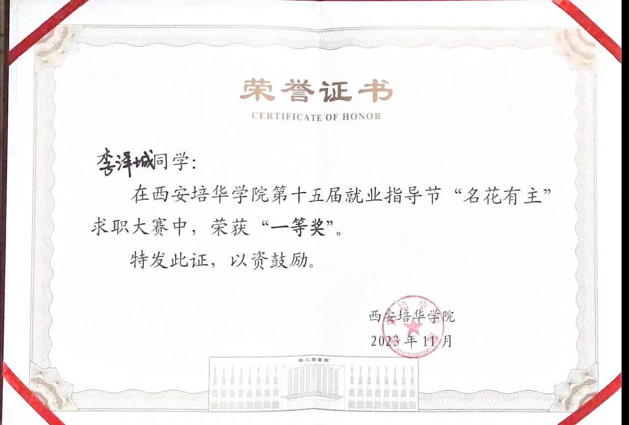 5.2023年11月获西安培华学院第十五届就业指导节名花有主求职大赛一等奖。