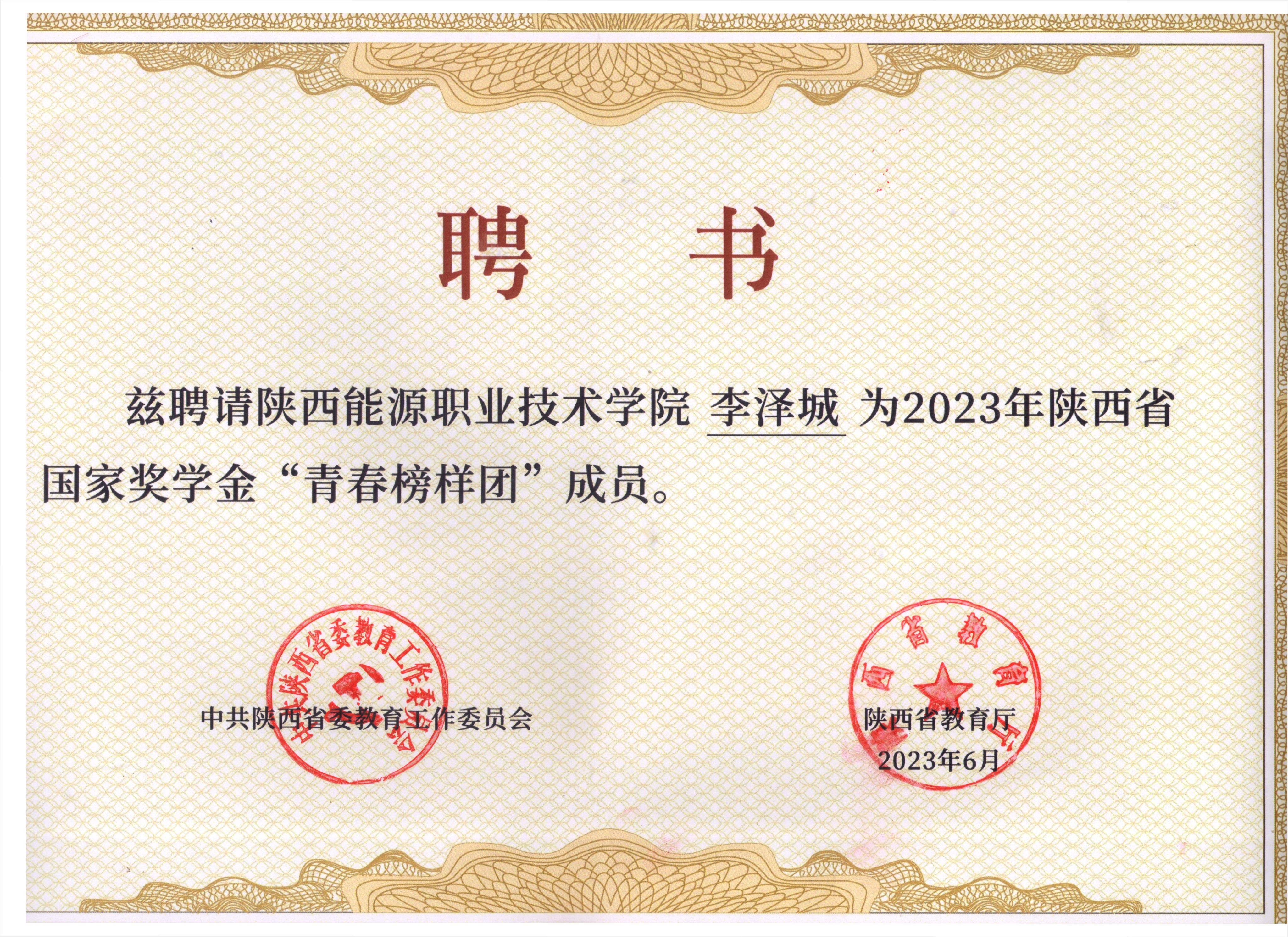 3.2023年6月被聘为陕西省国家奖学金“青春榜样说”成员;