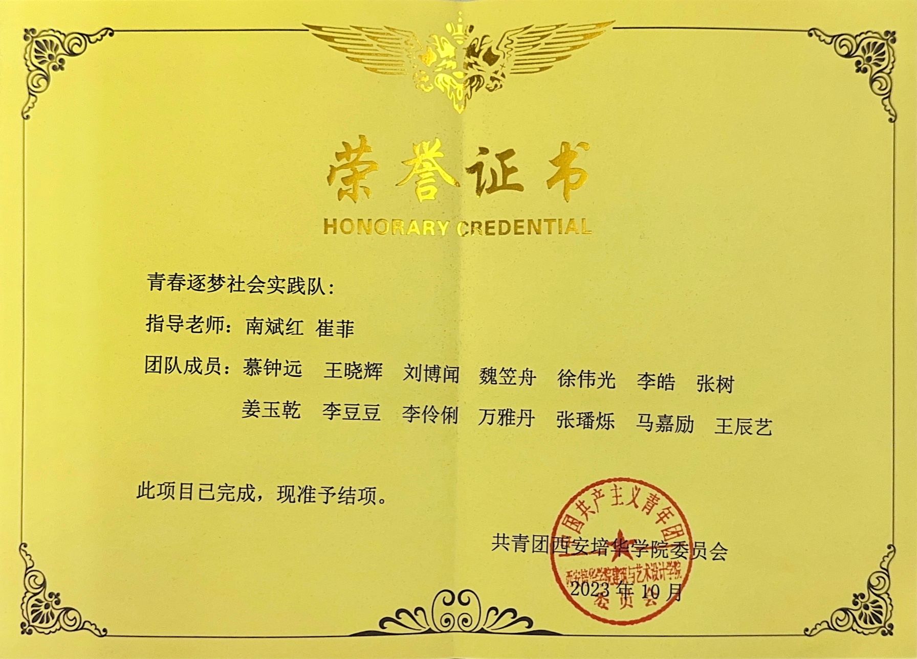 2022年慕钟远同学参加了在长安区西樊村开展的“绘梦青春·与乡同行”暑期三下乡社会实践,结合村庄特色以及专业特长,绘制24节气图,受到当地村民的一致好评,所在项目被列为校级重点项目,被评为2022年西安培华学院社会实践标兵团队。23年暑假慕钟远同学组织班级14名同学参加暑期三下乡社会实践,在商洛丹凤县武关镇梨园村开展“青春逐艺梦,画笔绘新乡”主题墙绘活动,在当地墙体绘制百米长卷,助力乡村振兴,也收获了丰富的实践成果,当地政府的表扬、村民的肯定。同时,结合“三下乡”地点丹凤县,参加陕西省红色旅游创意策划大赛,并经由学校审批推荐至省赛。